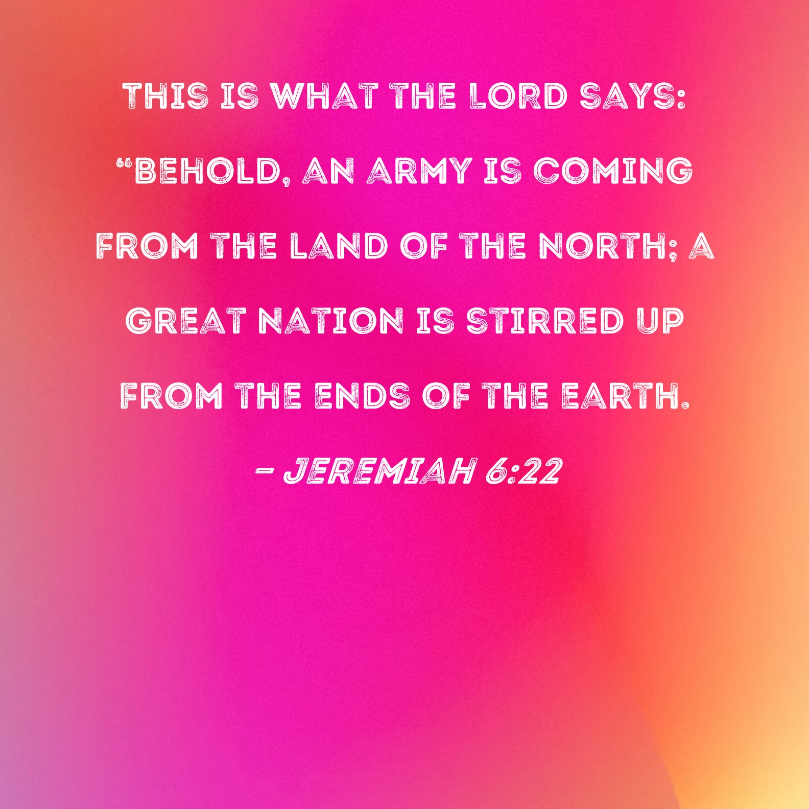 Jeremiah 6:22 This is what the LORD says: "Behold, an army is coming from the land of the north; a great nation is stirred up from the ends of the earth.