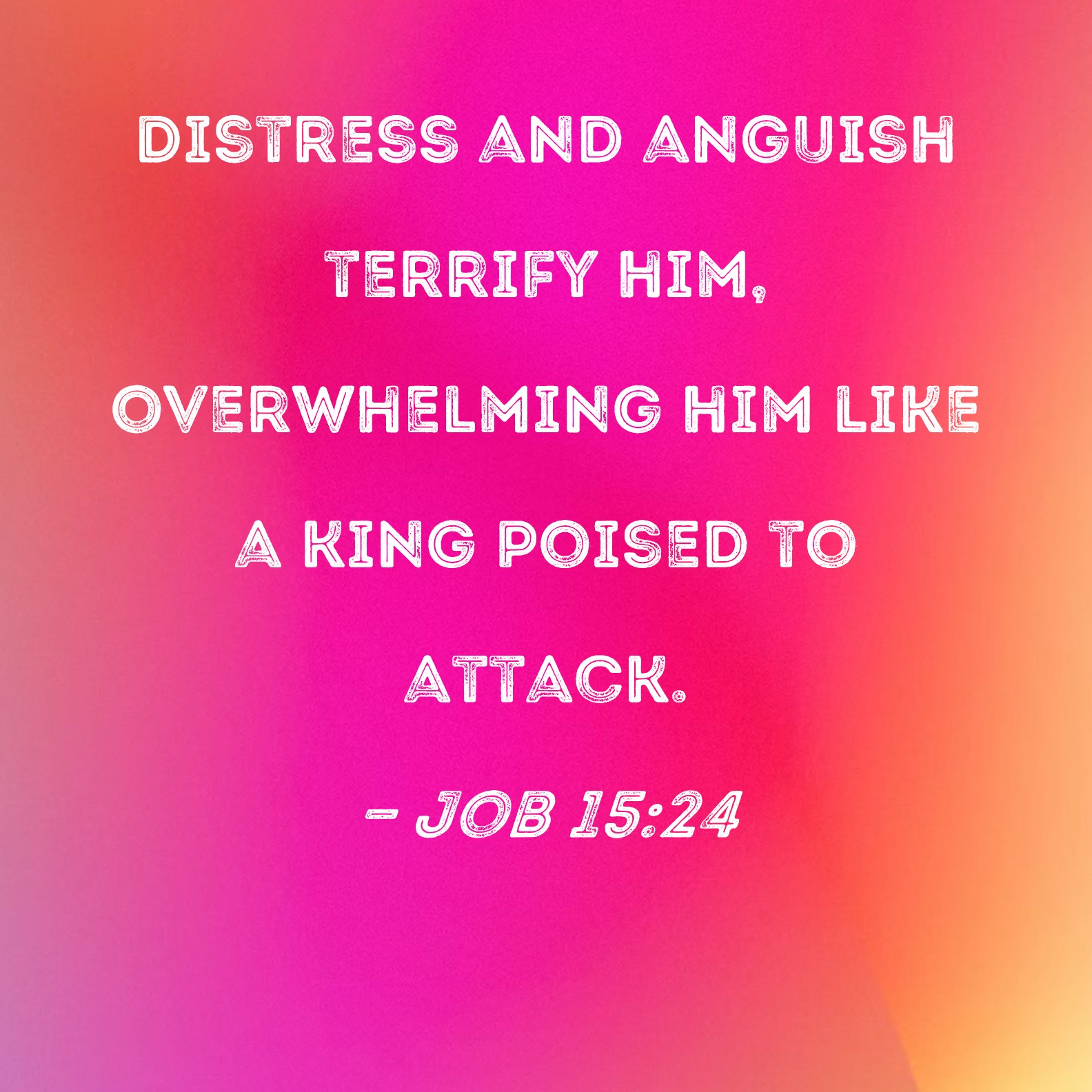 Job 15:24 Distress and anguish terrify him, overwhelming him like a king poised to attack.