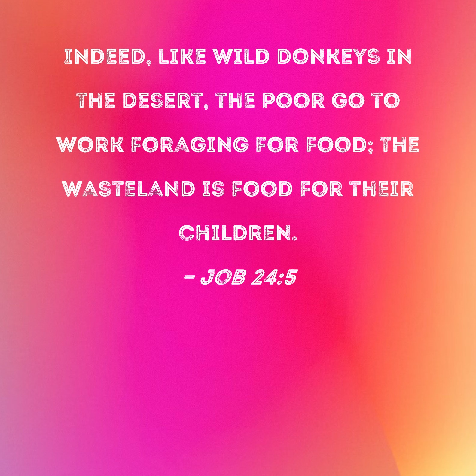 Job 24:5 Indeed, like wild donkeys in the desert, the poor go to work foraging for food; the wasteland is food for their children.