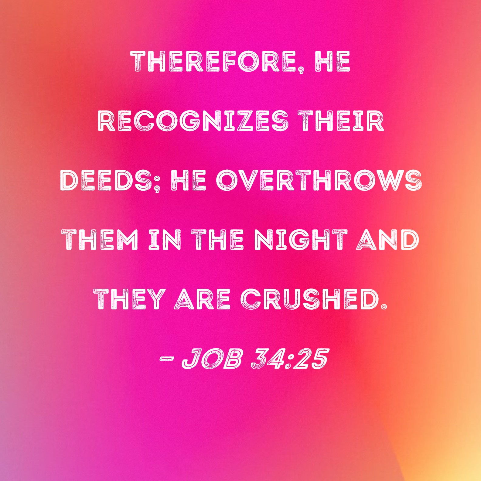 Job 34:25 Therefore, He recognizes their deeds; He overthrows them in the night and they are crushed.