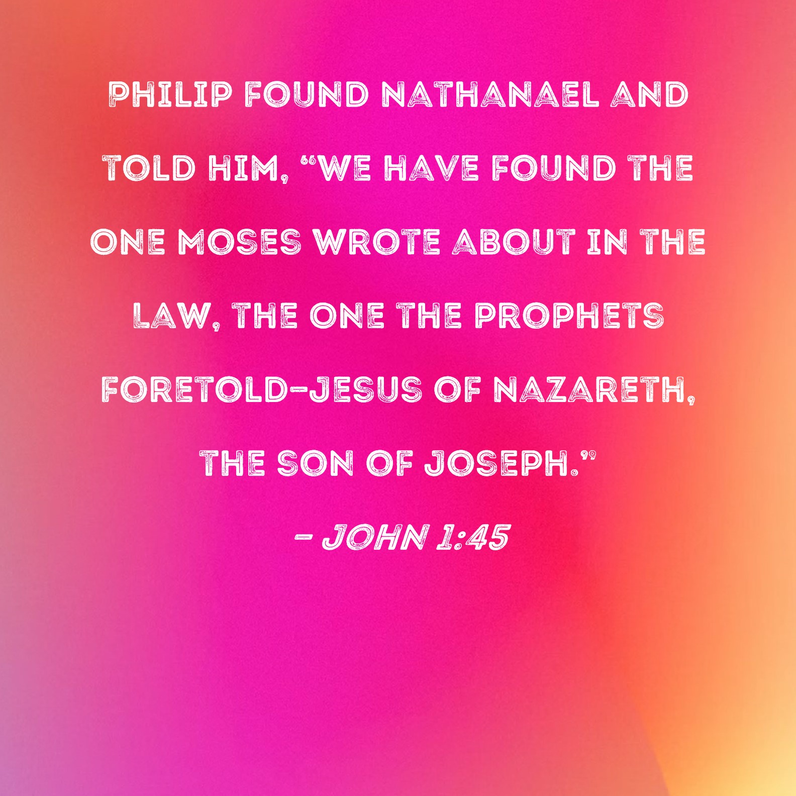 John 1:45 Philip found Nathanael and told him, "We have found the One Moses wrote about in the Law, the One the prophets foretold--Jesus of Nazareth, the son of Joseph."