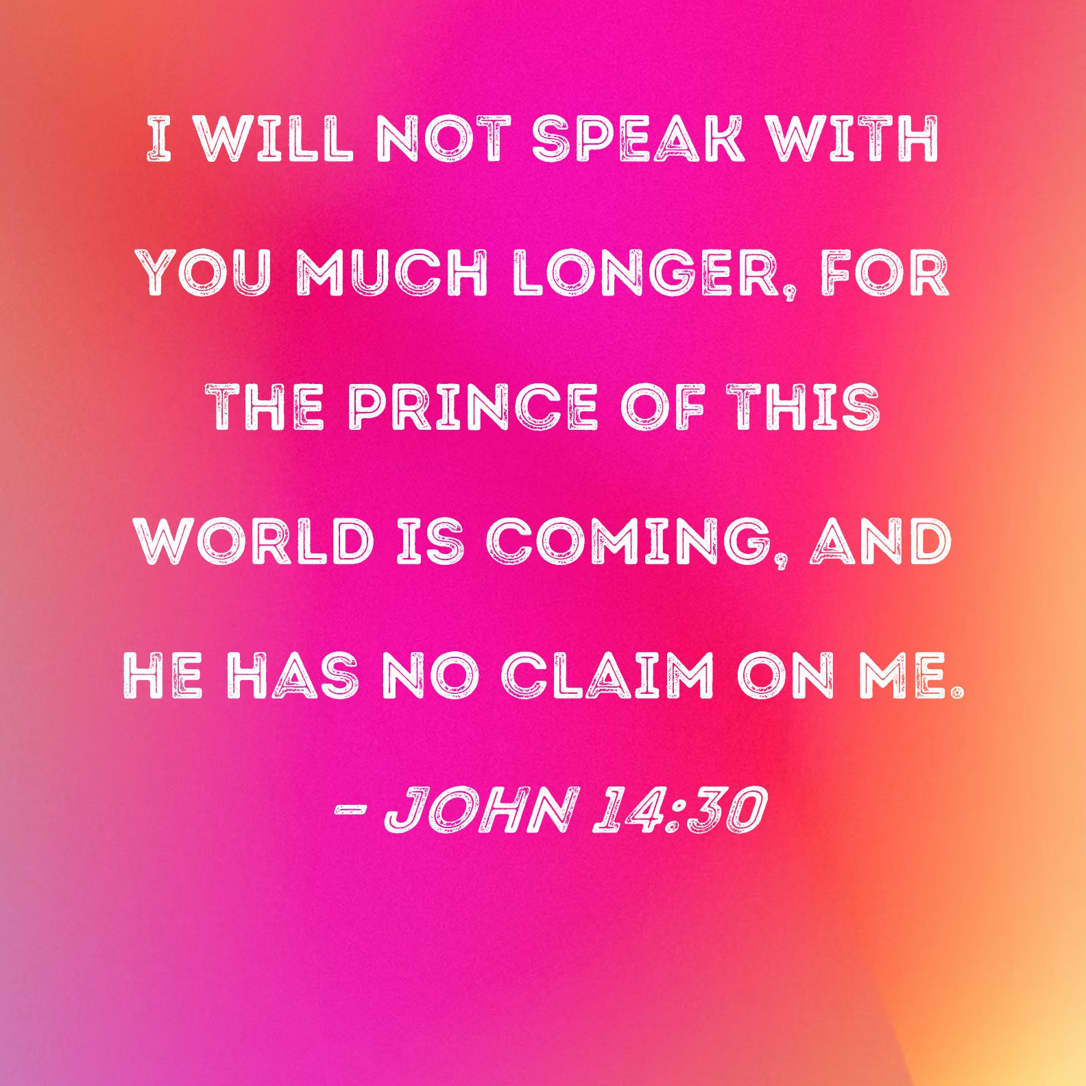 BSB: I will not speak with you much longer, for the prince of this world is coming, and he has no claim on Me. KJV: Hereafter I will not talk much with you: for the prince of this world cometh, and hath nothing in me. DRB: I will not now speak many things with you. For the prince of this world cometh, and in me he hath not any thing. DBT: I will no longer speak much with you, for the ruler of the world comes, and in me he has nothing; ERV: I will no more speak much with you, for the prince of the world cometh: and he hath nothing in me; WBT: Hereafter I will not talk much with you: for the prince of this world cometh, and hath nothing in me. WEB: I will no more speak much with you, for the prince of the world comes, and he has nothing in me. YLT: I will no more talk much with you, for the ruler of this world doth come, and in me he hath nothing;Links John 14:30 NIV • John 14:30 NLT • John 14:30 ESV • John 14:30 NASB • John 14:30 KJV • John 14:30 Interlinear • John 14:30 Commentaries • John 14:30 Parallel Texts • John 14:30 Bible Apps • John 14:30 Parallel • Bible Hub |