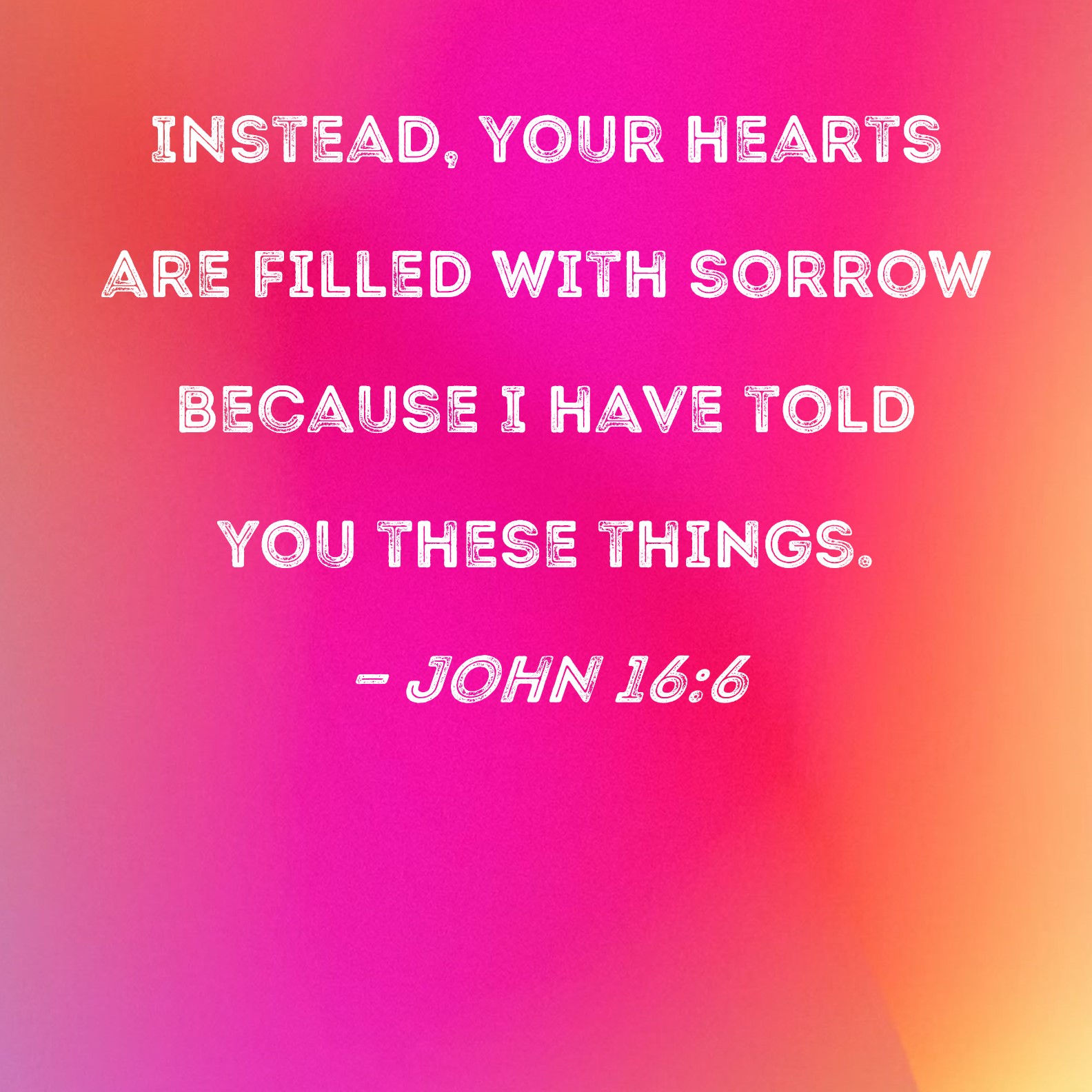 John 16:6 Instead, your hearts are filled with sorrow because I have told you these things.