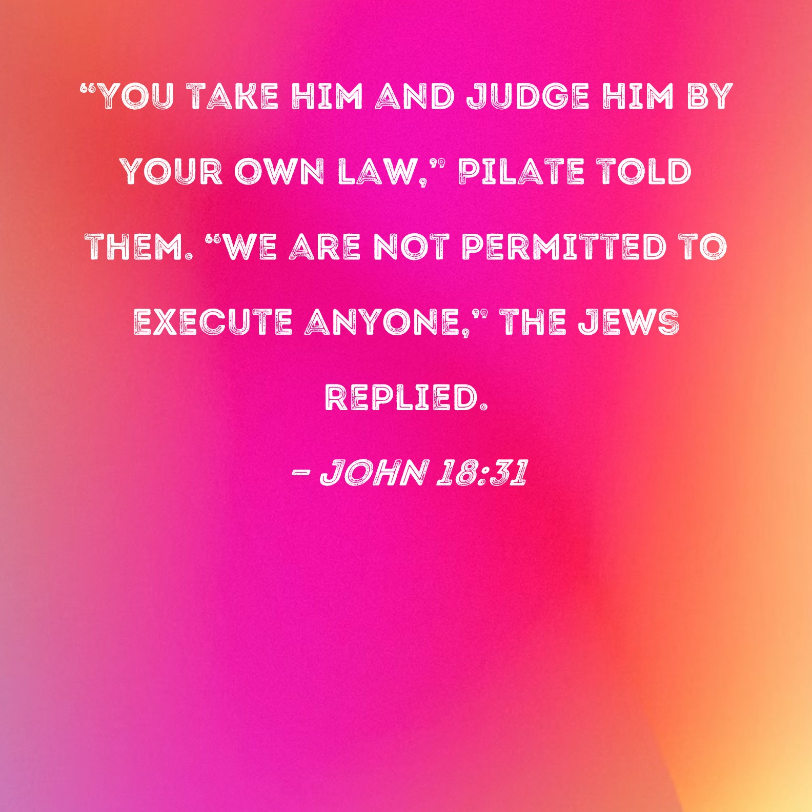 John 18:31 "You take Him and judge Him by your own law," Pilate told them. "We are not permitted to execute anyone," the Jews replied.
