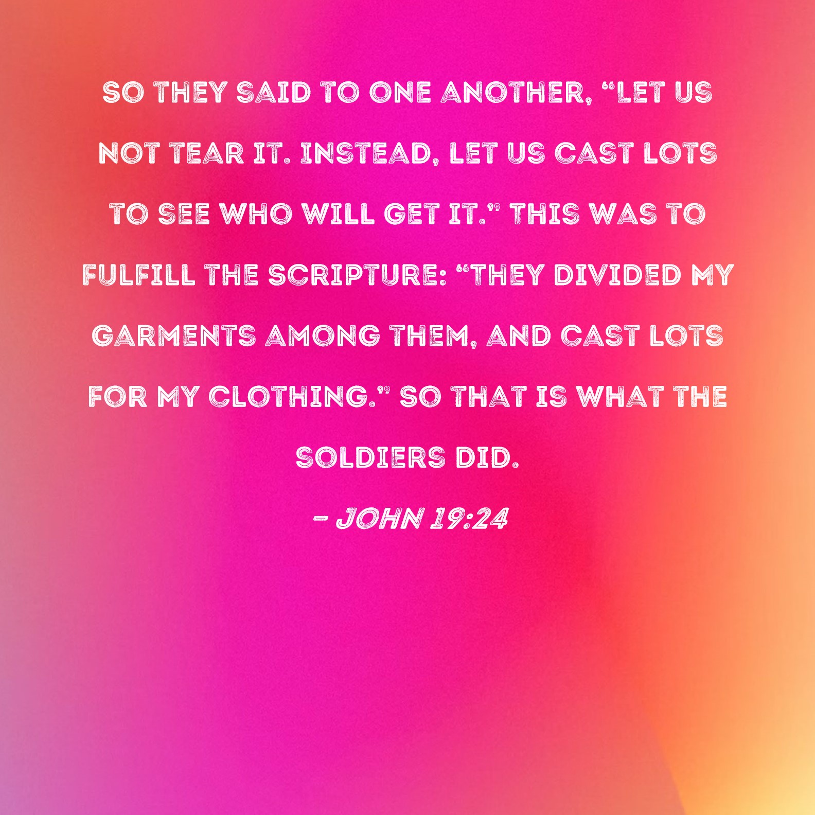 John 19:24 So they said to one another, "Let us not tear it. Instead, let us cast lots to see who will get it." This was to fulfill the Scripture: "They divided My garments among them, and cast lots for My clothing." So that is what the soldiers did.