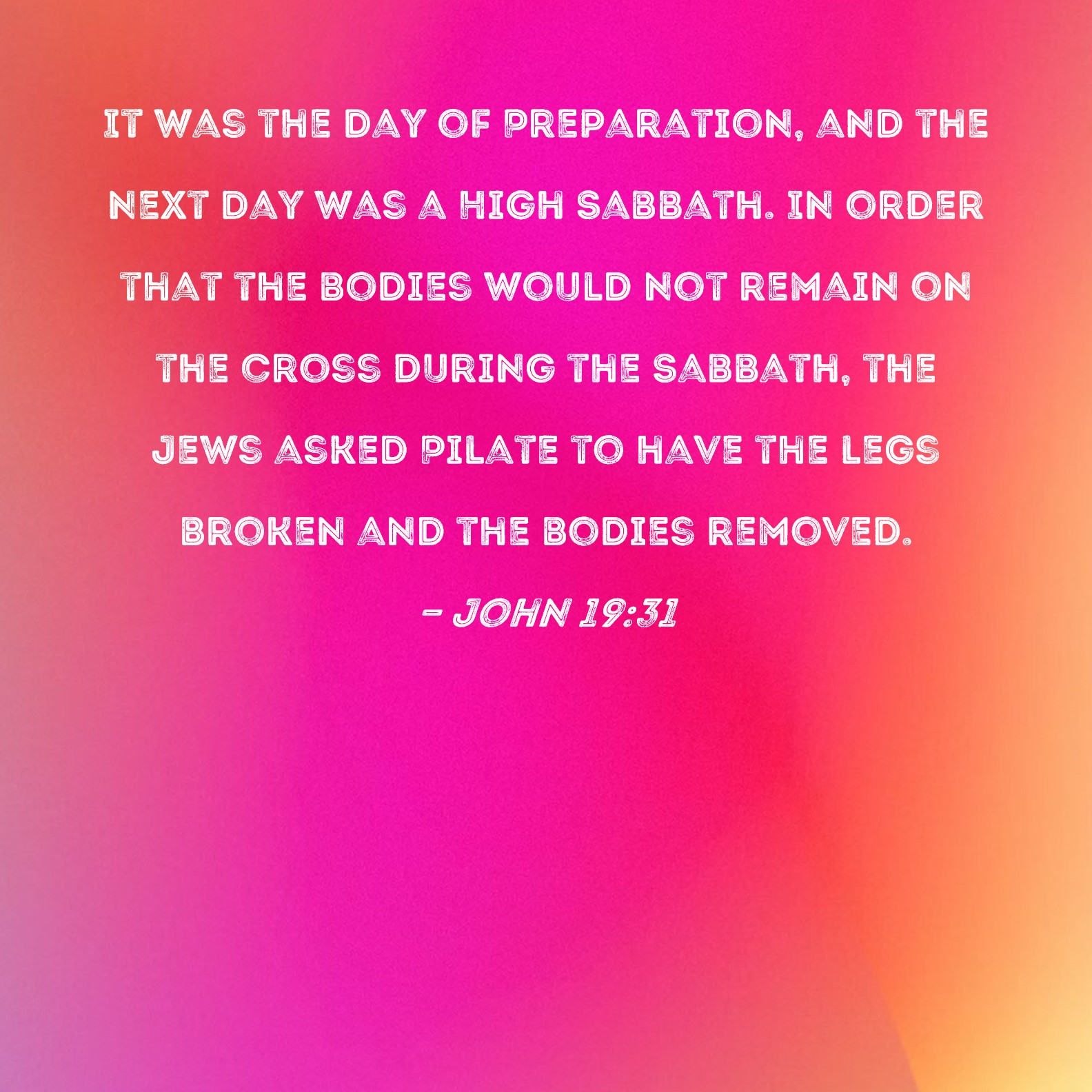 John 19:31 It was the day of Preparation, and the next day was a High Sabbath. In order that the bodies would not remain on the cross during the Sabbath, the Jews asked Pilate to have the legs broken and the bodies removed.