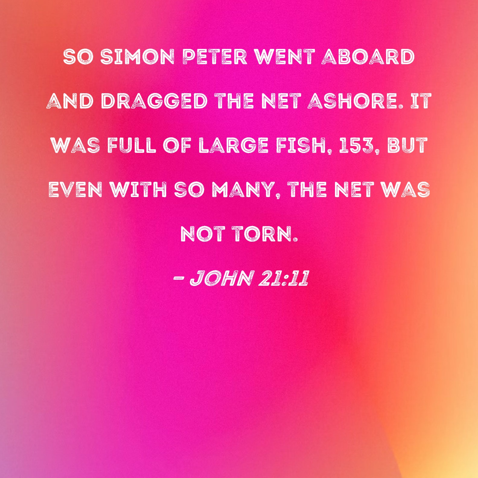 John 21:11 So Simon Peter went aboard and dragged the net ashore. It was full of large fish, 153, but even with so many, the net was not torn.