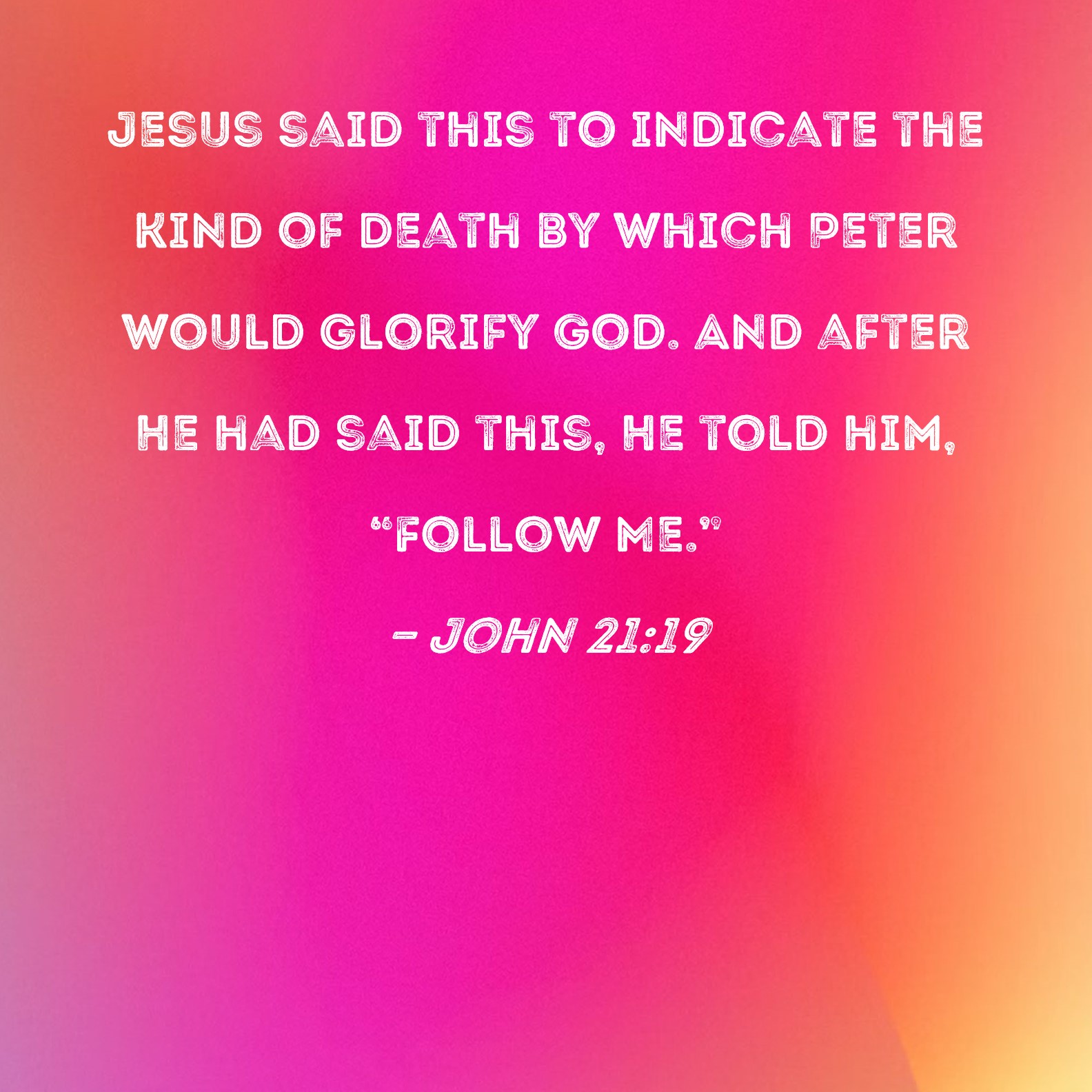 John 21:19 Jesus said this to indicate the kind of death by which Peter would glorify God. And after He had said this, He told him, "Follow Me."