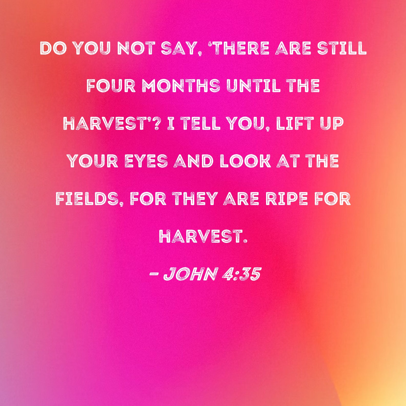 John 4:35 Do you not say, 'There are still four months until the harvest'? I tell you, lift up your eyes and look at the fields, for they are ripe for harvest.
