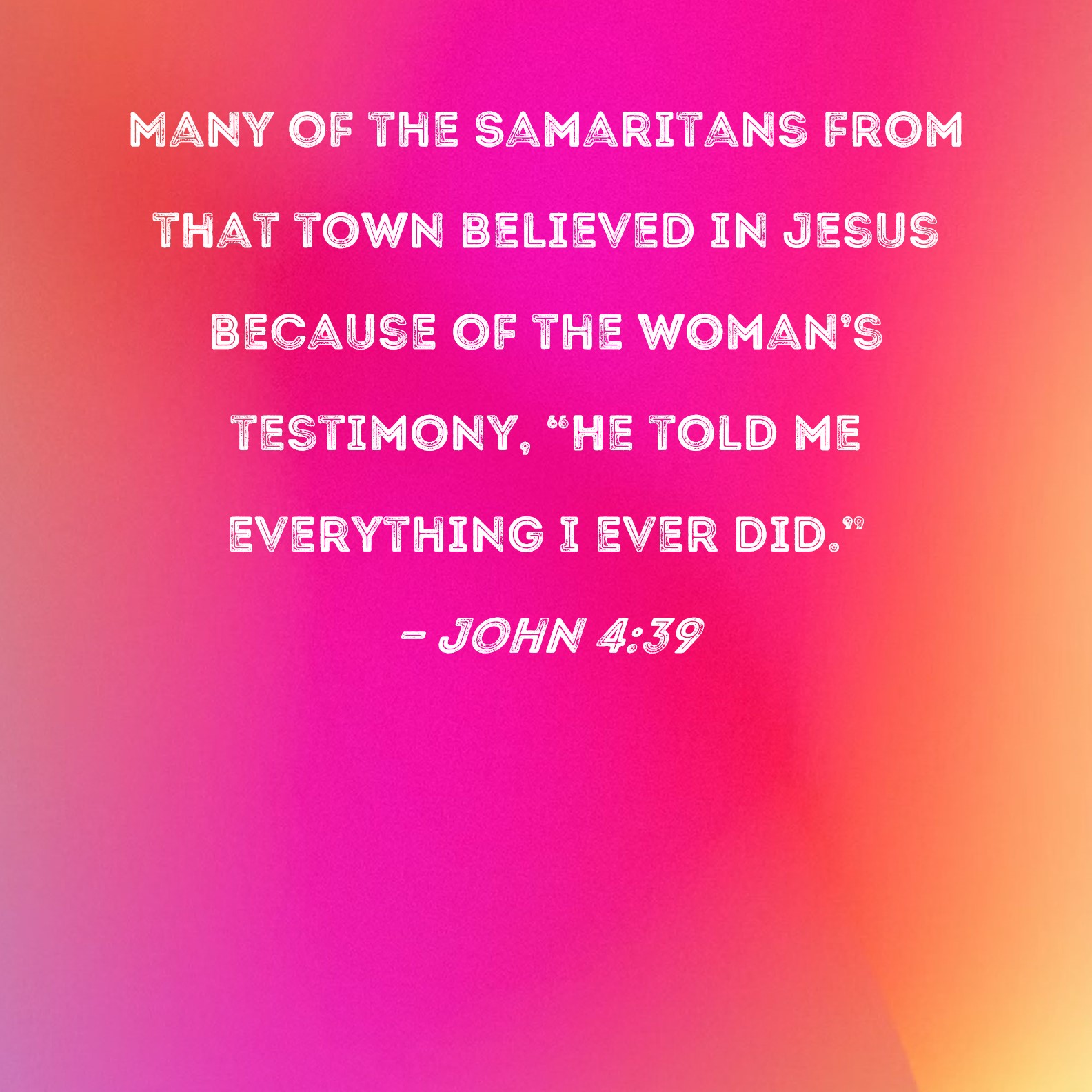 John 4:39 Many of the Samaritans from that town believed in Jesus because of the woman's testimony, "He told me everything I ever did."