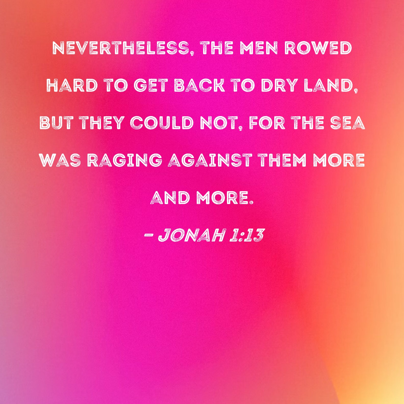 Jonah 1:13 Nevertheless, the men rowed hard to get back to dry land, but they could not, for the sea was raging against them more and more.
