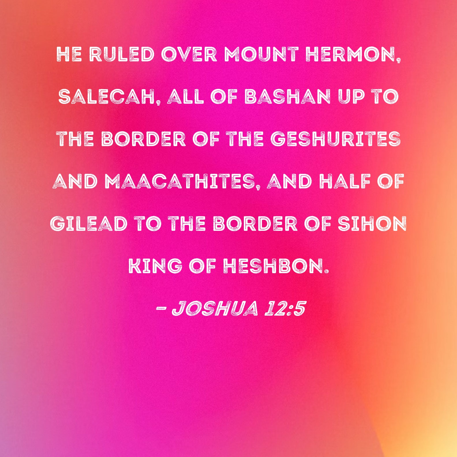 Joshua 12:5 He ruled over Mount Hermon, Salecah, all of Bashan up to the border of the Geshurites and Maacathites, and half of Gilead to the border of Sihon king of Heshbon.