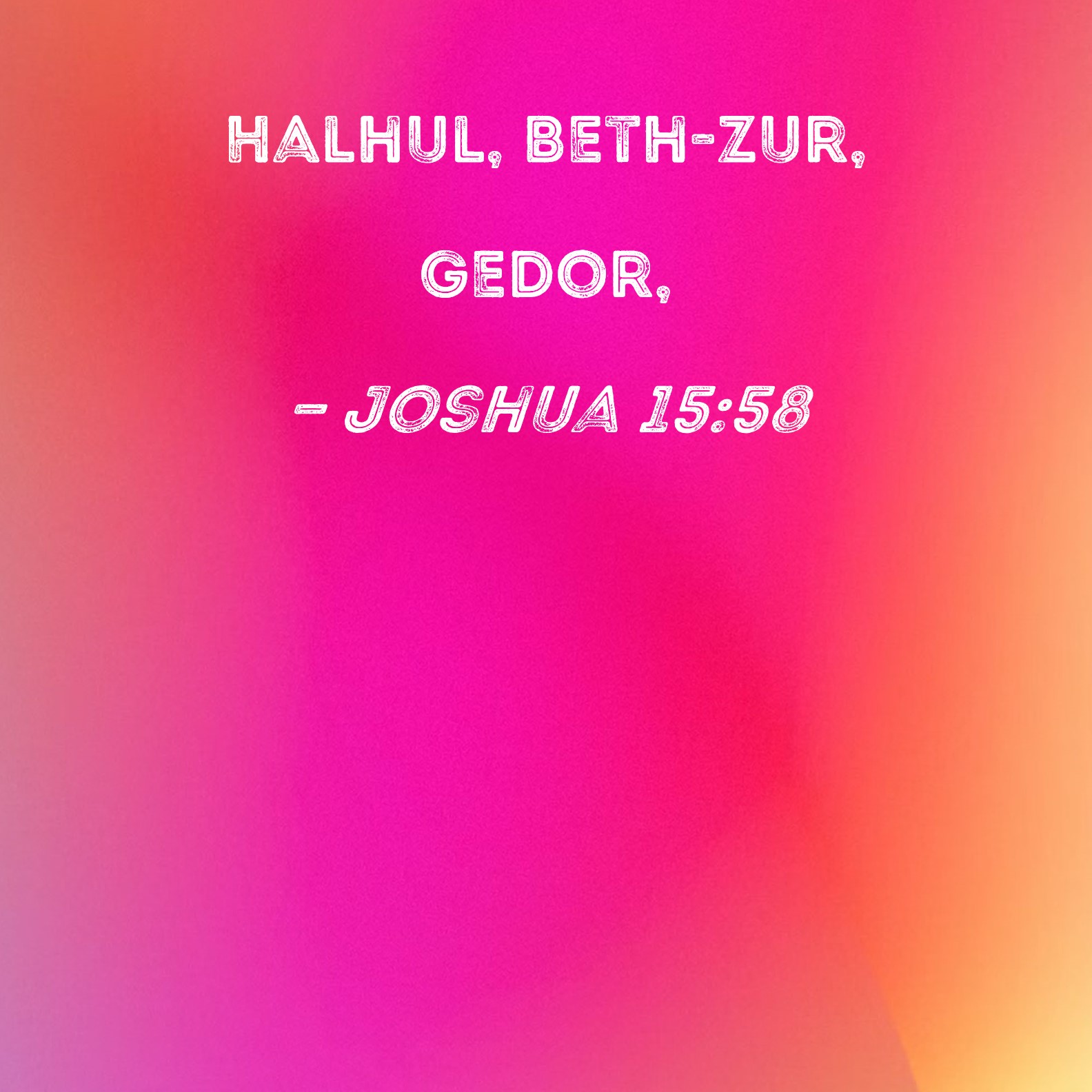 BSB: Halhul, Beth-zur, Gedor, KJV: Halhul, Bethzur, and Gedor, DRB: Halhul, and Bessur, and Gedor, DBT: Halhul, Beth-Zur, and Gedor, ERV: Halhul, Beth-zur, and Gedor; WBT: Halhul, Beth-zur, and Gedor, WEB: Halhul, Beth Zur, Gedor, YLT: Halhul, Beth-Zur, and Gedor,Links Joshua 15:58 NIV • Joshua 15:58 NLT • Joshua 15:58 ESV • Joshua 15:58 NASB • Joshua 15:58 KJV • Joshua 15:58 Interlinear • Joshua 15:58 Commentaries • Joshua 15:58 Parallel Texts • Joshua 15:58 Bible Apps • Joshua 15:58 Parallel • Bible Hub |