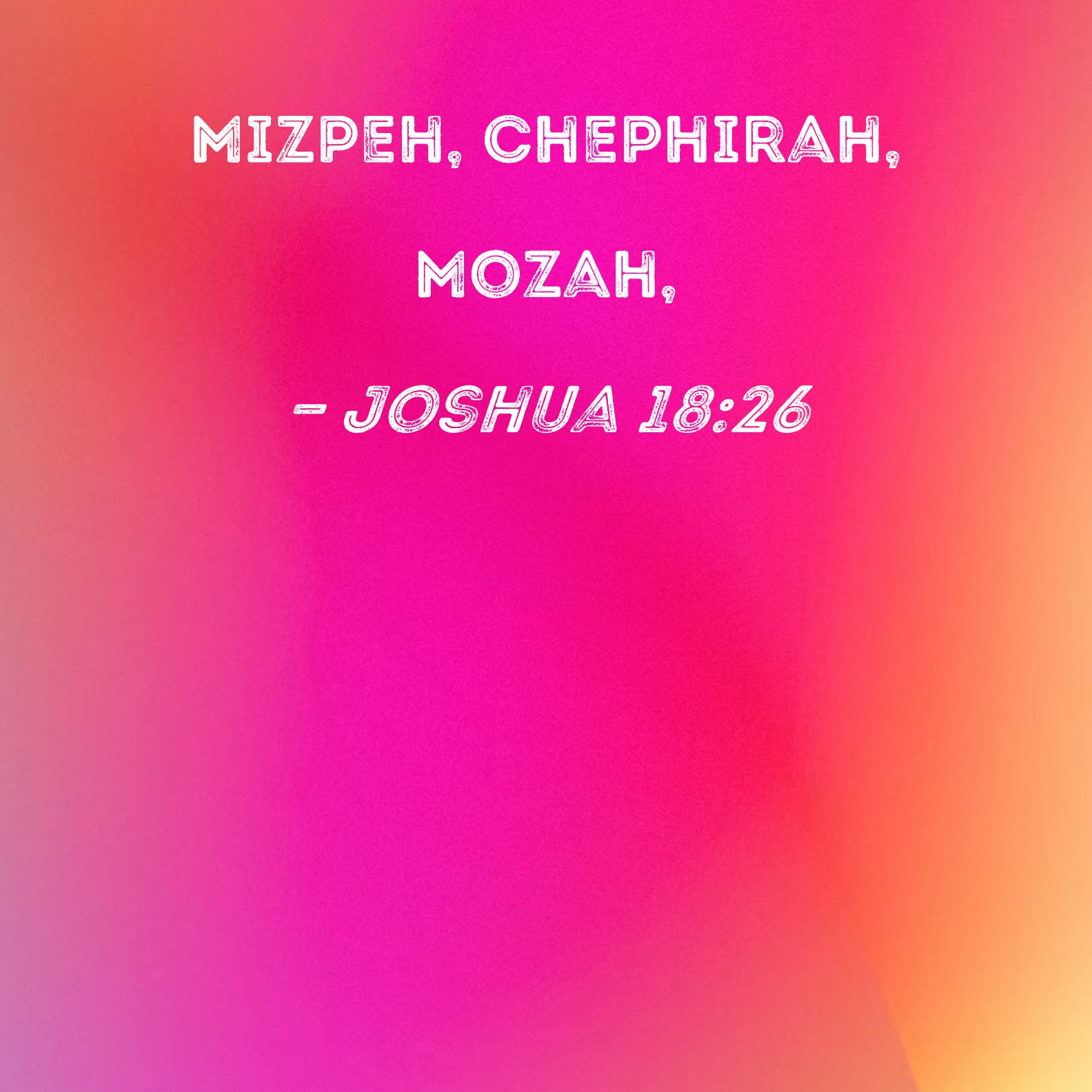 BSB: Mizpeh, Chephirah, Mozah, KJV: And Mizpeh, and Chephirah, and Mozah, DRB: 26And Mesphe, and Caphara, and Amosa, DBT: and Mizpeh, and Chephirah, and Mozah, ERV: and Mizpeh, and Chephirah, and Mozah; WBT: And Mizpeh, and Chephirah, and Mozah, WEB: Mizpeh, Chephirah, Mozah, YLT: and Mizpeh, and Chephirah, and Mozah,Links Joshua 18:26 NIV • Joshua 18:26 NLT • Joshua 18:26 ESV • Joshua 18:26 NASB • Joshua 18:26 KJV • Joshua 18:26 Interlinear • Joshua 18:26 Commentaries • Joshua 18:26 Parallel Texts • Joshua 18:26 Bible Apps • Joshua 18:26 Parallel • Bible Hub |