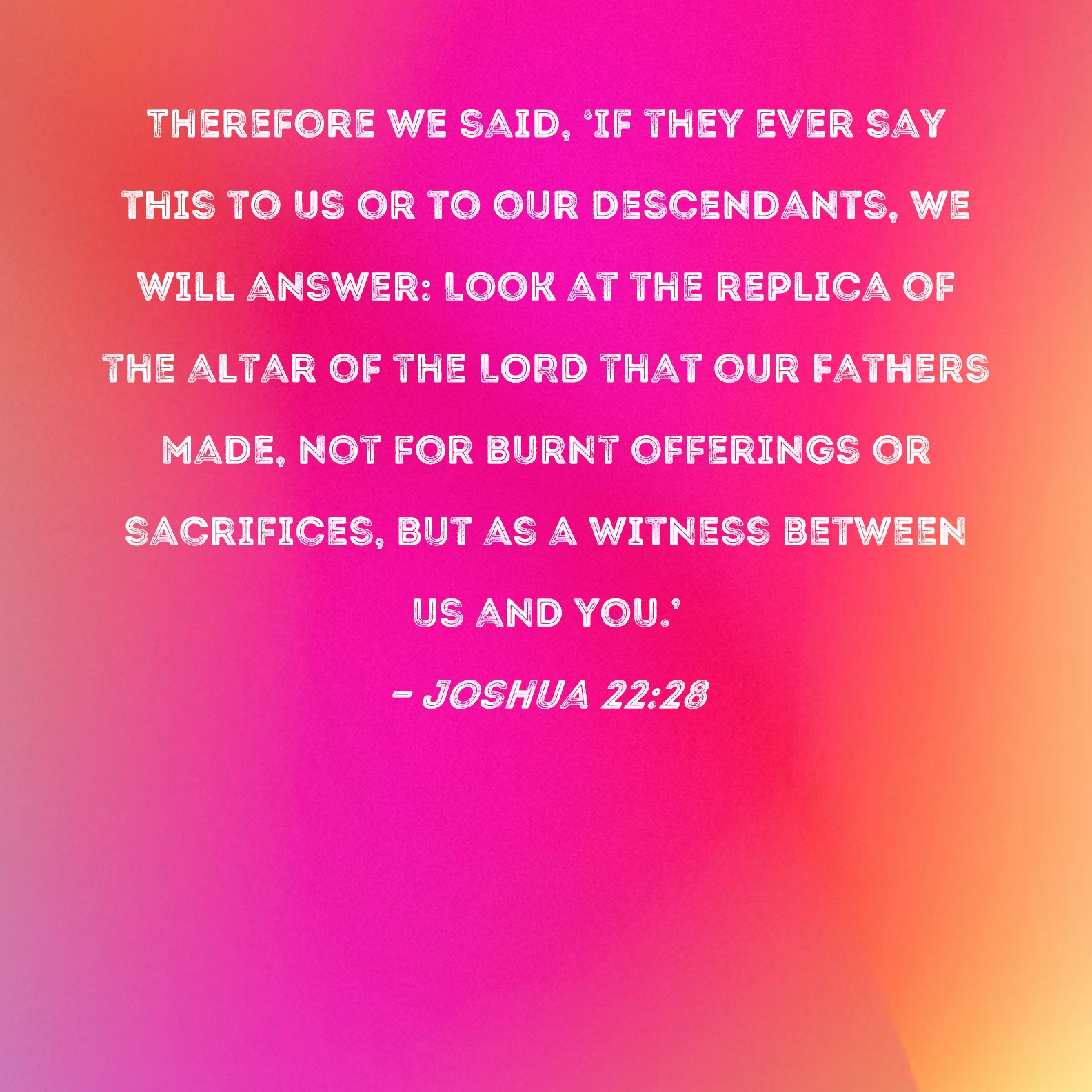 Joshua 22:28 Therefore we said, 'If they ever say this to us or to our descendants, we will answer: Look at the replica of the altar of the LORD that our fathers made, not for burnt offerings or sacrifices, but as a witness between us and you.'