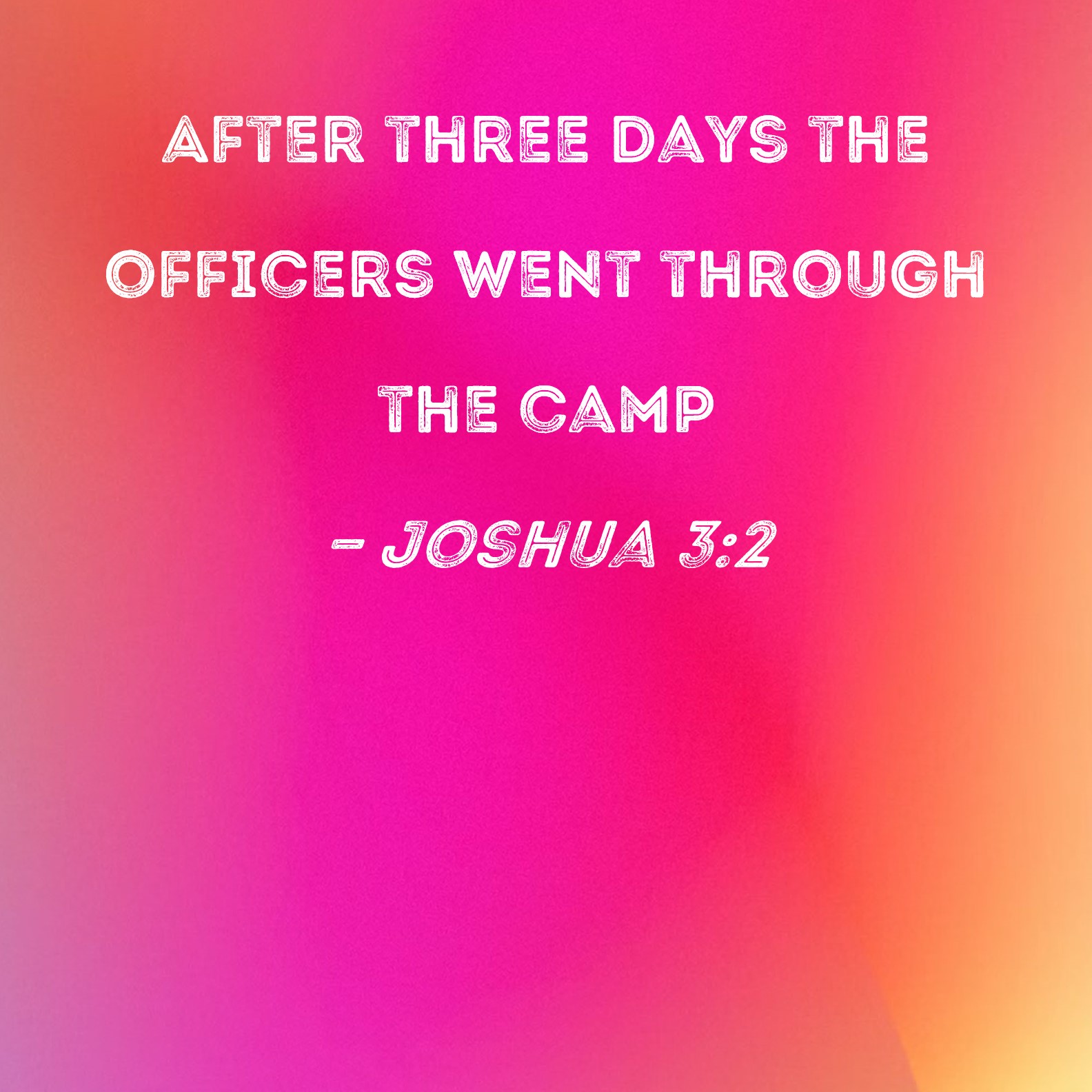 BSB: After three days the officers went through the camp KJV: And it came to pass after three days, that the officers went through the host; DRB: After which, the heralds went through the midst of the camp, DBT: And it came to pass at the end of three days, that the officers went through the camp; ERV: And it came to pass after three days, that the officers went through the midst of the camp; WBT: And it came to pass after three days, that the officers went through the host; WEB: After three days, the officers went through the middle of the camp; YLT: And it cometh to pass, at the end of three days, that the authorities pass over into the midst of the camp,Links Joshua 3:2 NIV • Joshua 3:2 NLT • Joshua 3:2 ESV • Joshua 3:2 NASB • Joshua 3:2 KJV • Joshua 3:2 Interlinear • Joshua 3:2 Commentaries • Joshua 3:2 Parallel Texts • Joshua 3:2 Bible Apps • Joshua 3:2 Parallel • Bible Hub |