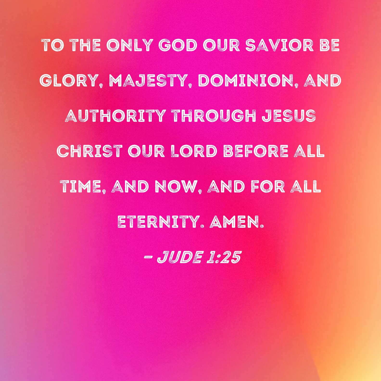 Jude 1:25 to the only God our Savior be glory, majesty, dominion, and authority through Jesus Christ our Lord before all time, and now, and for all eternity. Amen.