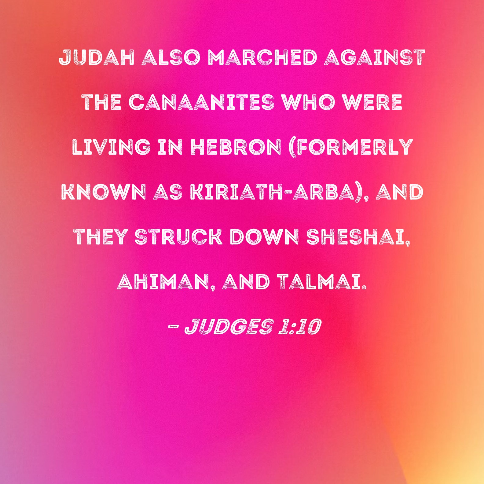 Judges 1:10 Judah also marched against the Canaanites who were living in Hebron (formerly known as Kiriath-arba), and they struck down Sheshai, Ahiman, and Talmai.