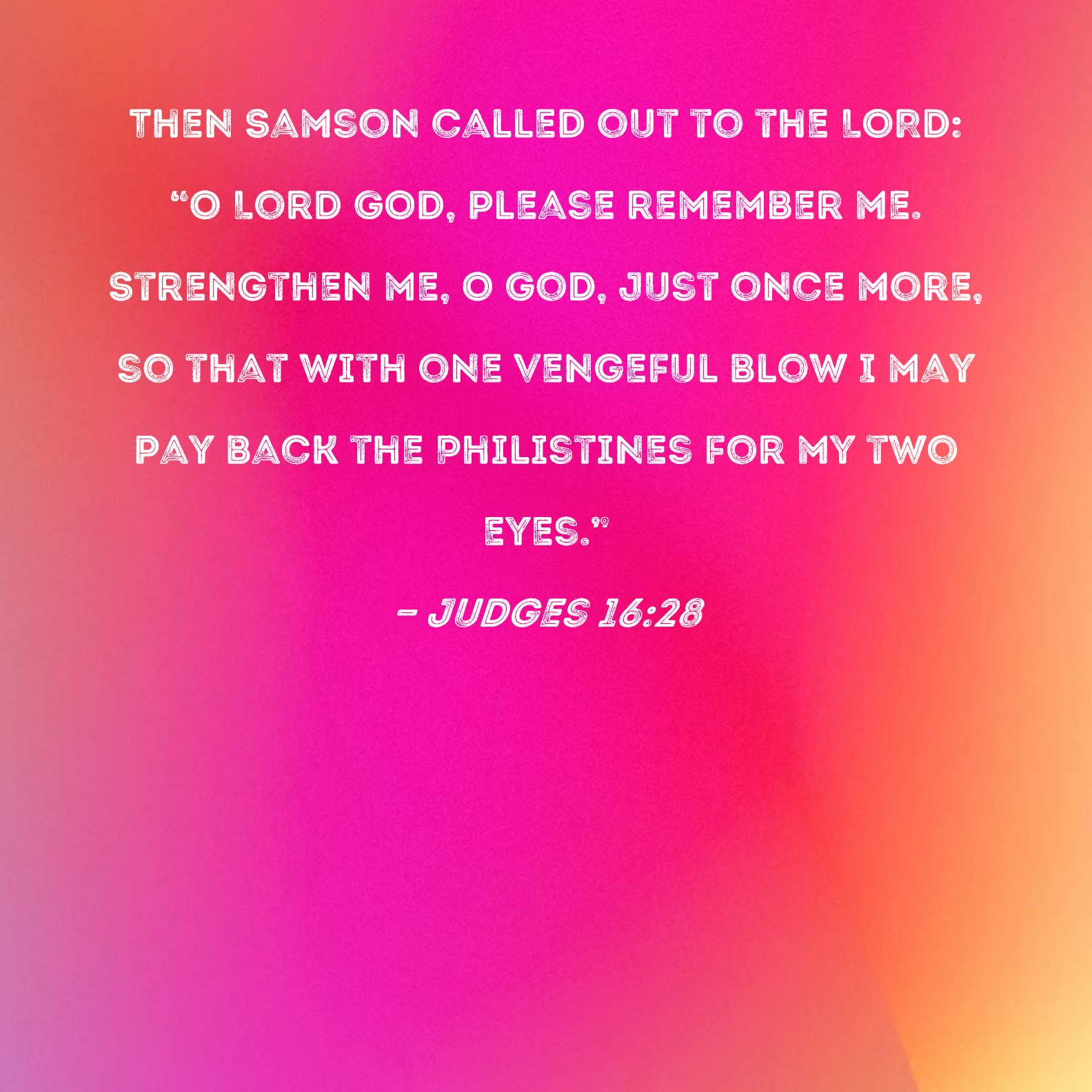 Judges 16:28 Then Samson called out to the LORD: "O Lord GOD, please remember me. Strengthen me, O God, just once more, so that with one vengeful blow I may pay back the Philistines for my two eyes."