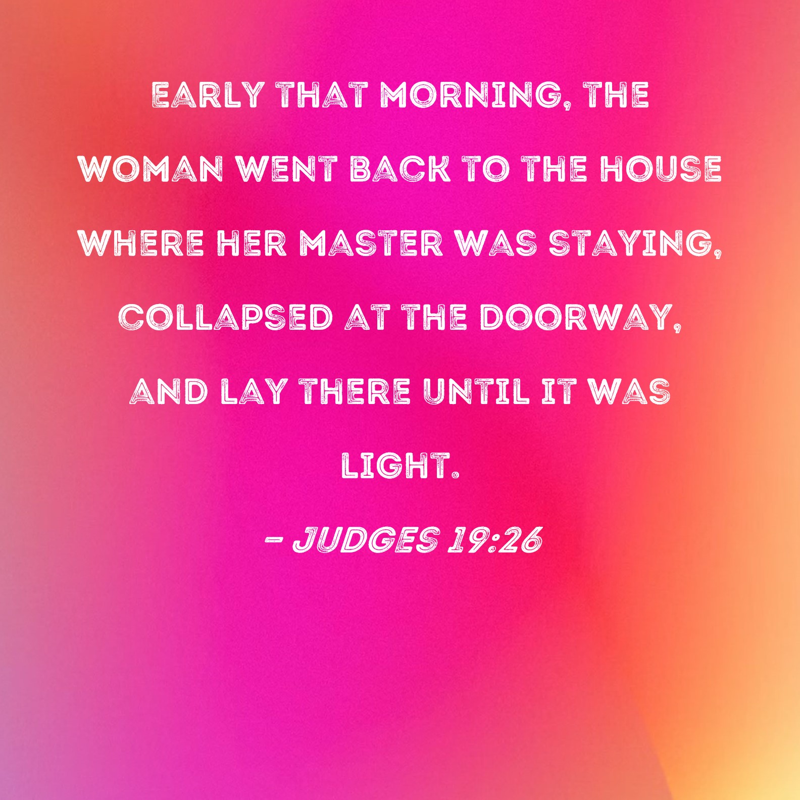 Judges 19:26 Early that morning, the woman went back to the house where her master was staying, collapsed at the doorway, and lay there until it was light.