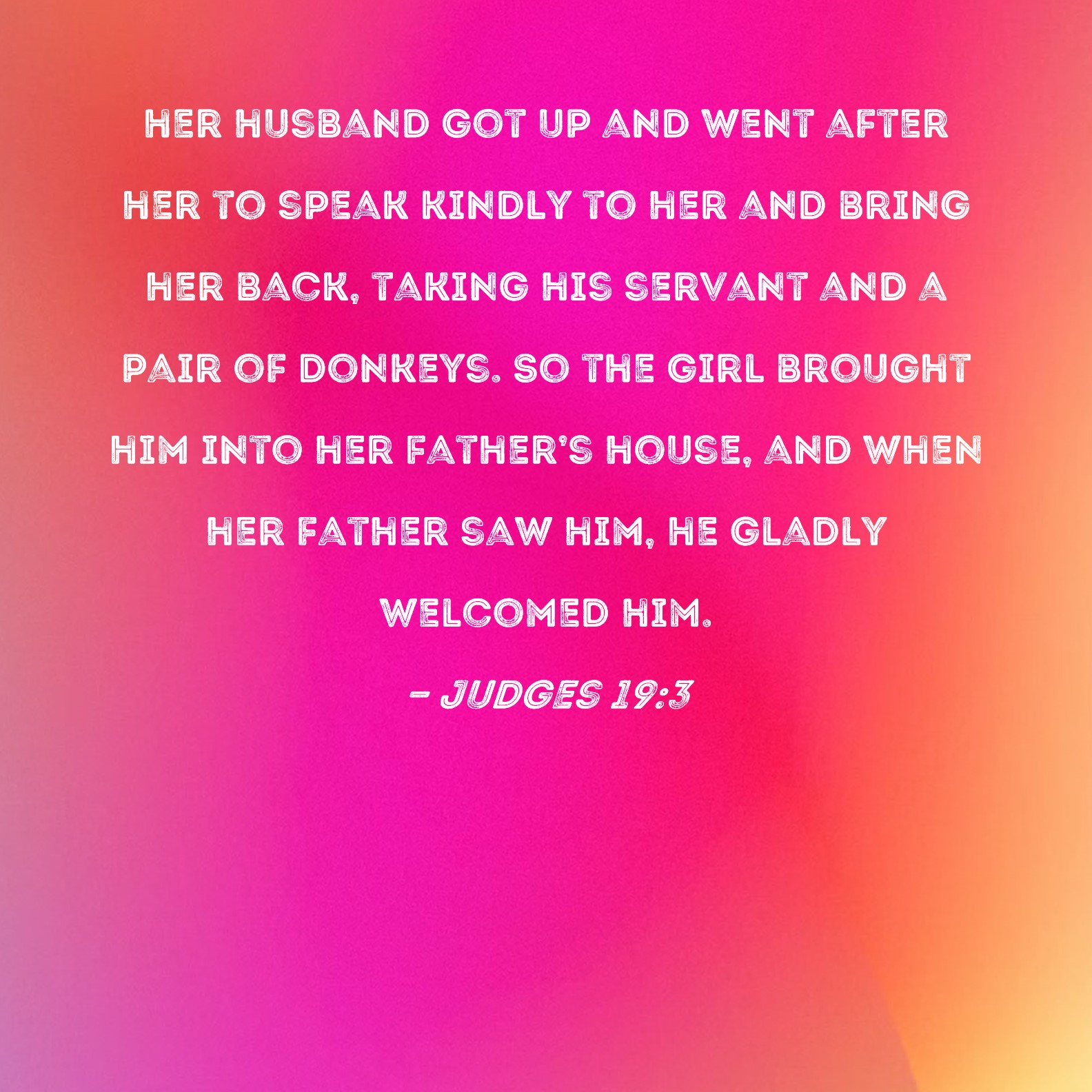 Judges 19:3 her husband got up and went after her to speak kindly to her and bring her back, taking his servant and a pair of donkeys. So the girl brought him into her father's house, and when her father saw him, he gladly welcomed him.