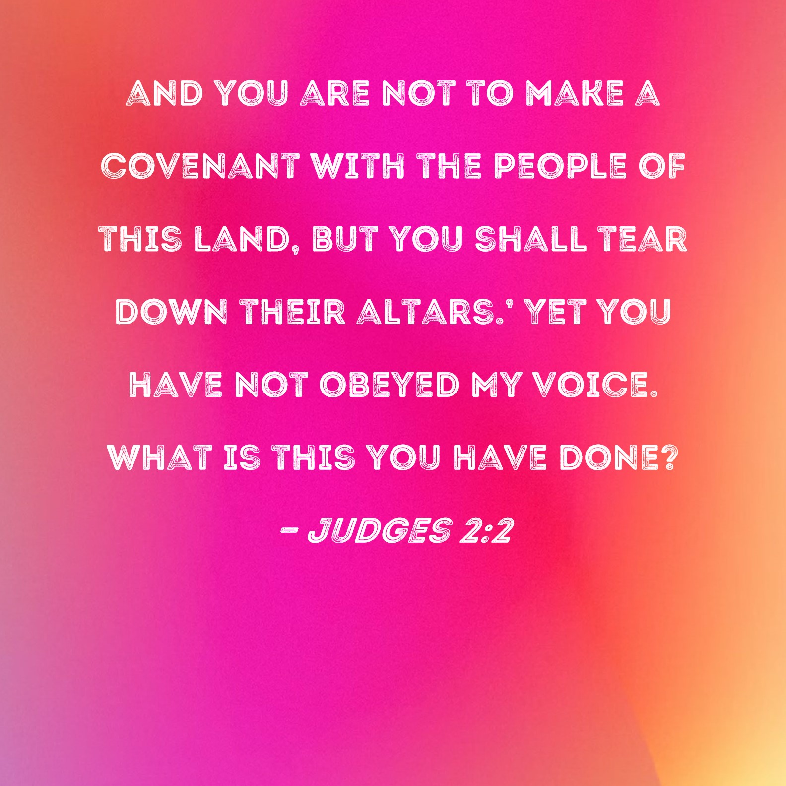 Judges 2:2 and you are not to make a covenant with the people of this land, but you shall tear down their altars.' Yet you have not obeyed My voice. What is this you have done?