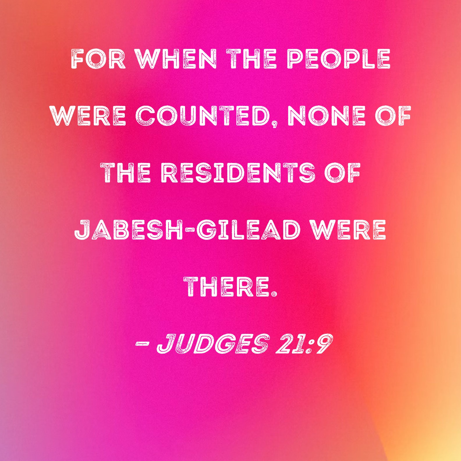 Judges 21:9 For when the people were counted, none of the residents of Jabesh-gilead were there.
