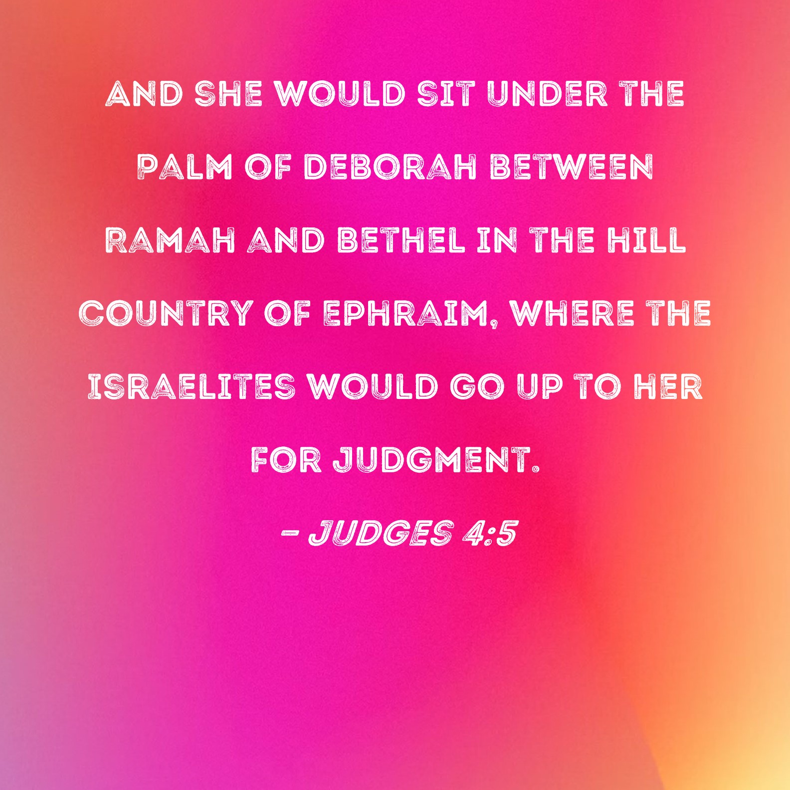 Judges 4:5 And she would sit under the Palm of Deborah between Ramah and Bethel in the hill country of Ephraim, where the Israelites would go up to her for judgment.