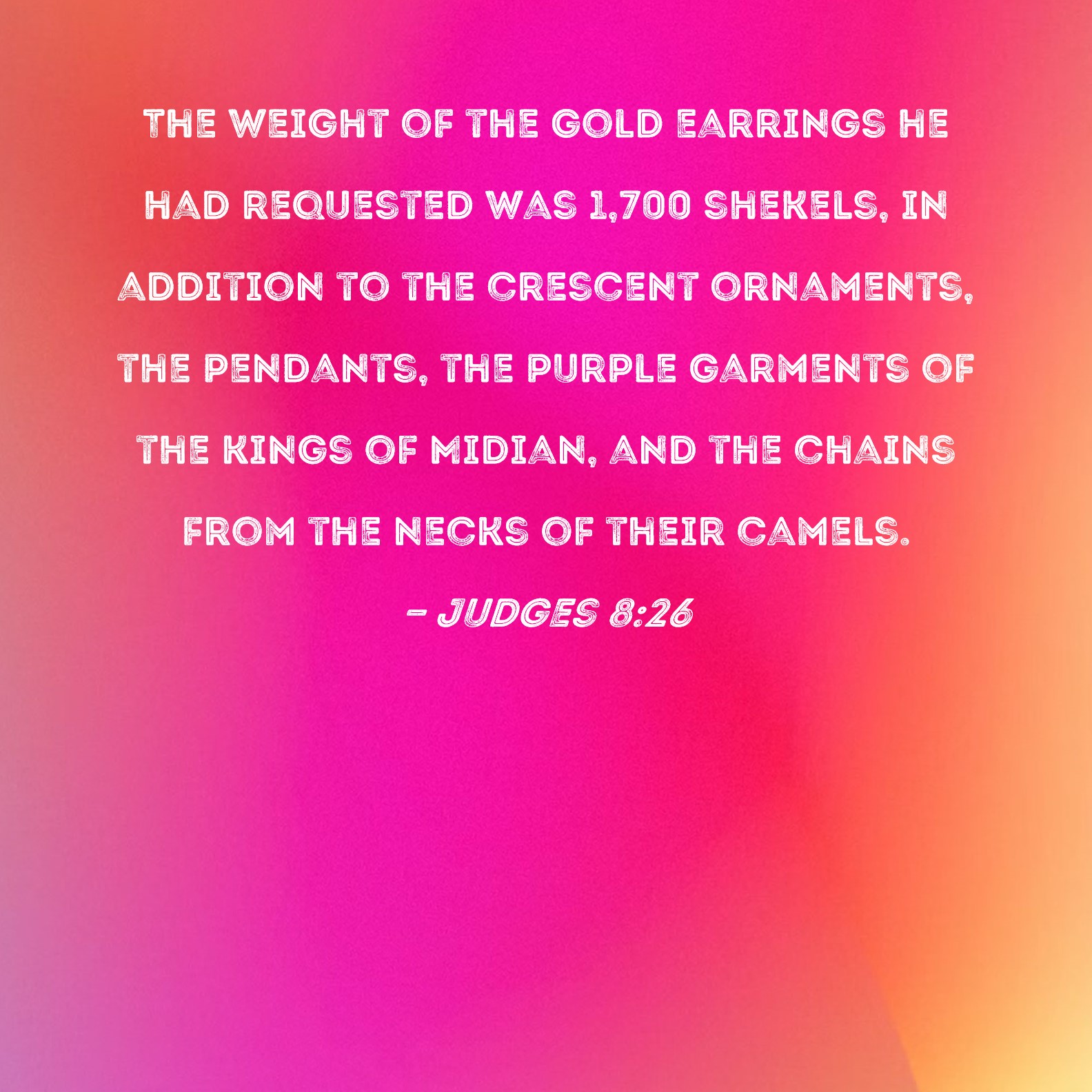 Judges 8:26 The weight of the gold earrings he had requested was 1,700 shekels, in addition to the crescent ornaments, the pendants, the purple garments of the kings of Midian, and the chains from the necks of their camels.