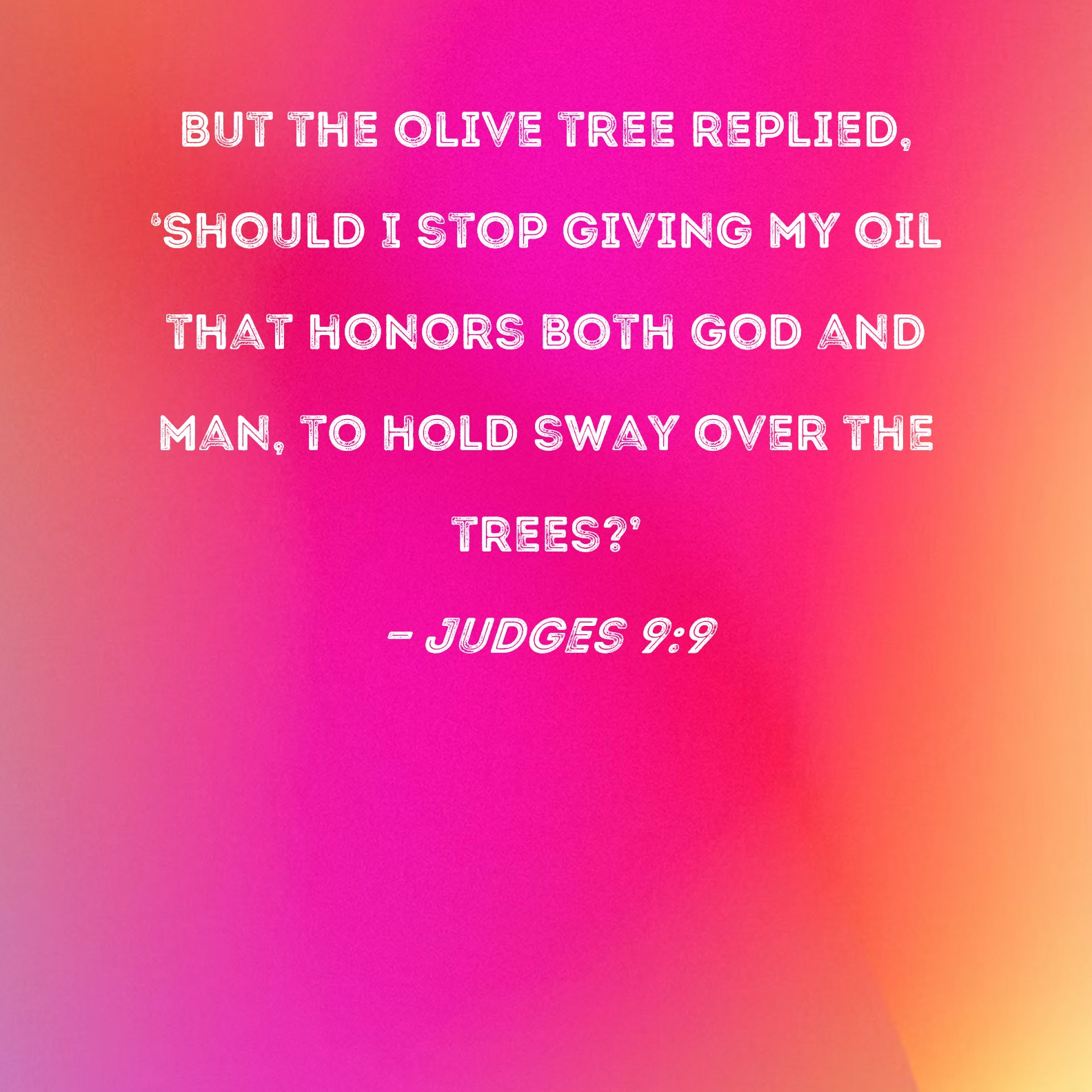 Judges 9:9 But the olive tree replied, 'Should I stop giving my oil that honors both God and man, to hold sway over the trees?'