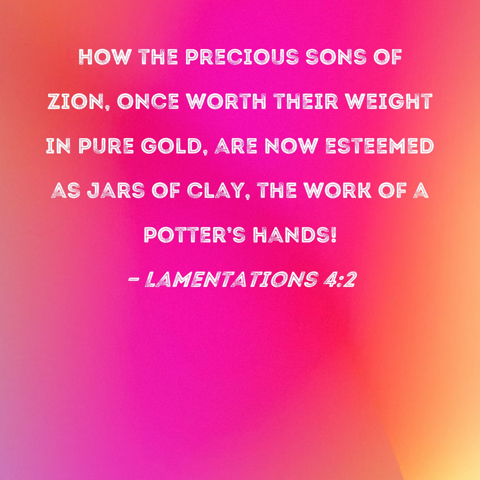 Lamentations 4:2 How the precious sons of Zion, once worth their weight in pure gold, are now esteemed as jars of clay, the work of a potter's hands!