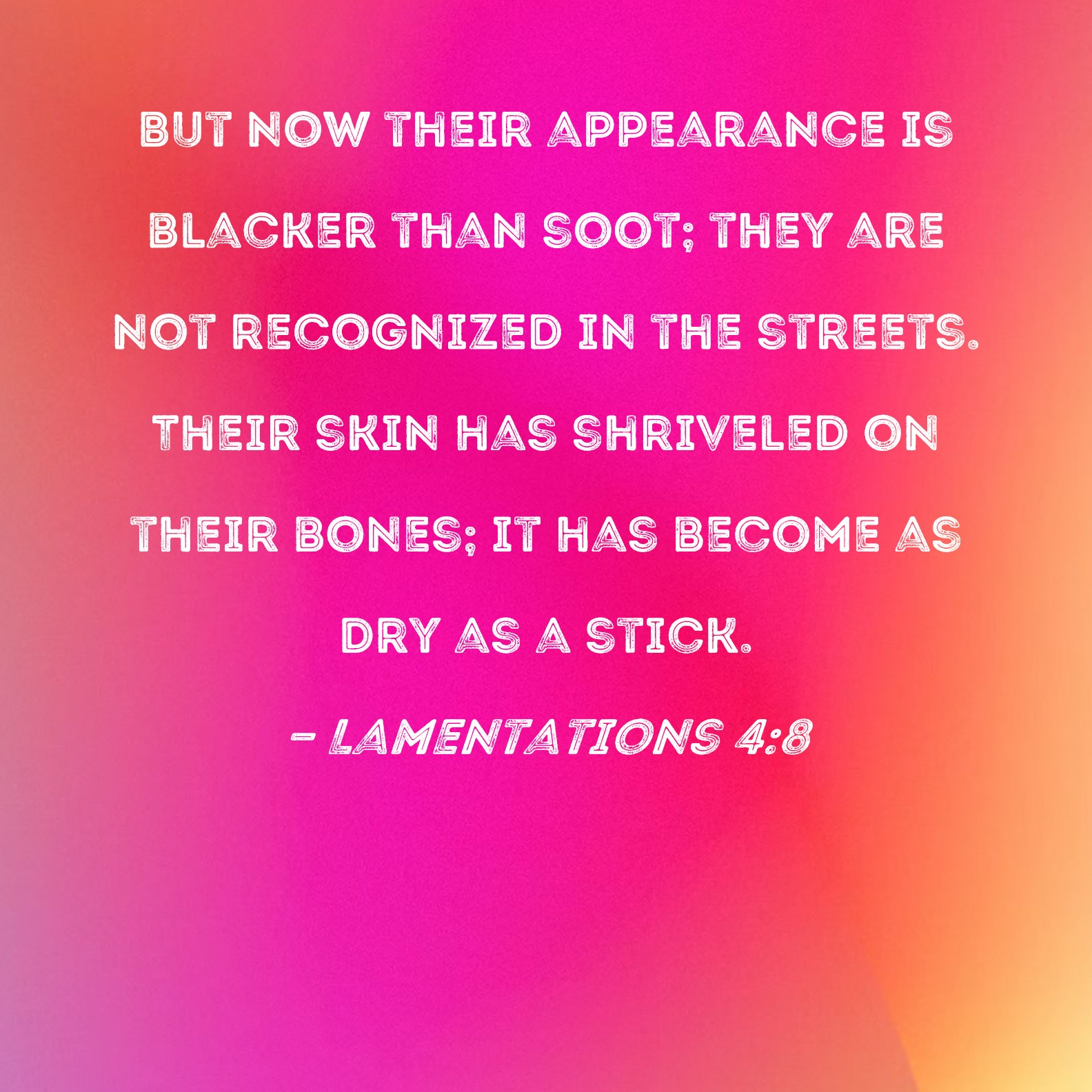 Lamentations 4:8 But now their appearance is blacker than soot; they are not recognized in the streets. Their skin has shriveled on their bones; it has become as dry as a stick.