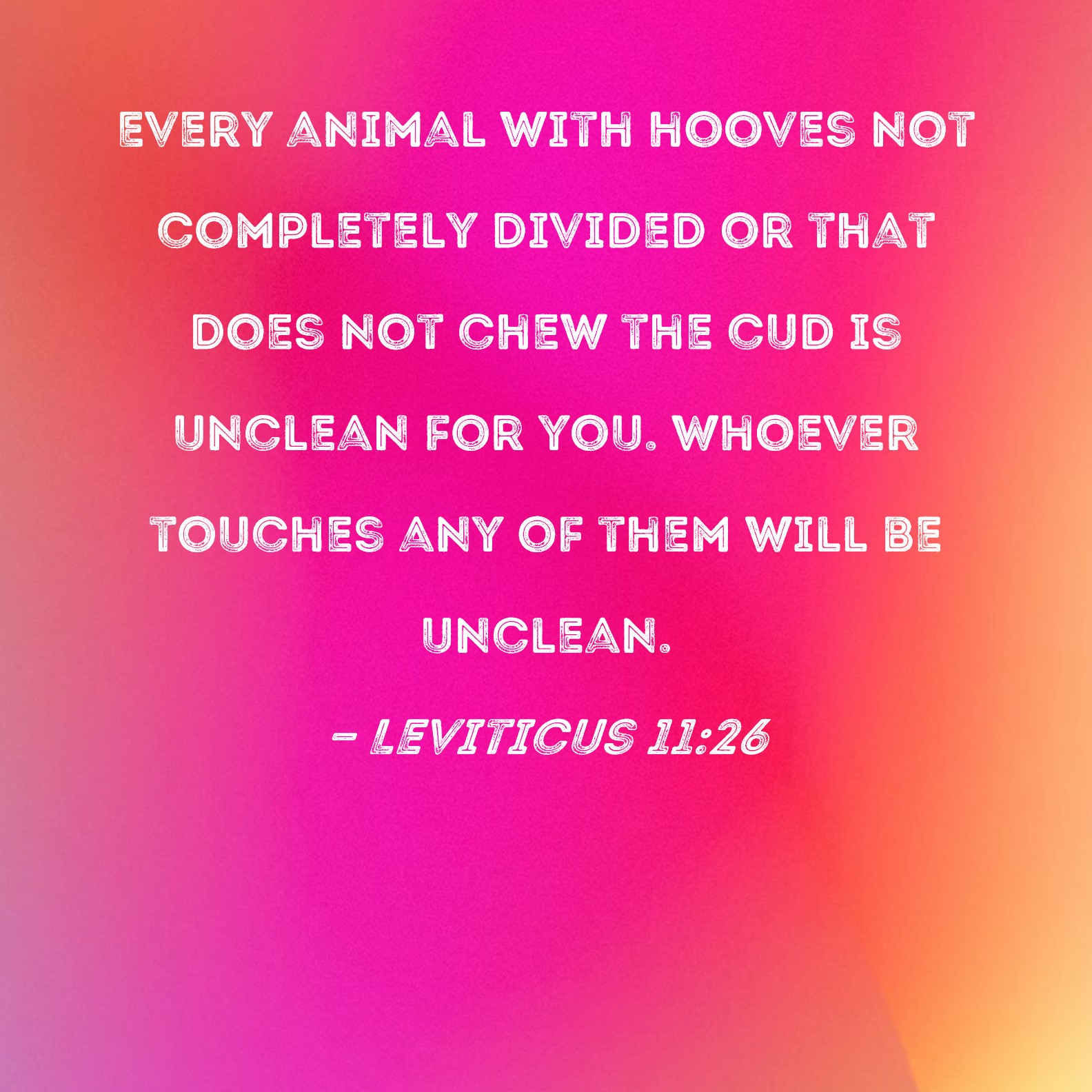 WEB:  “‘Every animal which has a split hoof that isn’t completely divided, or doesn’t chew the cud, is unclean to you. Everyone who touches them shall be unclean.