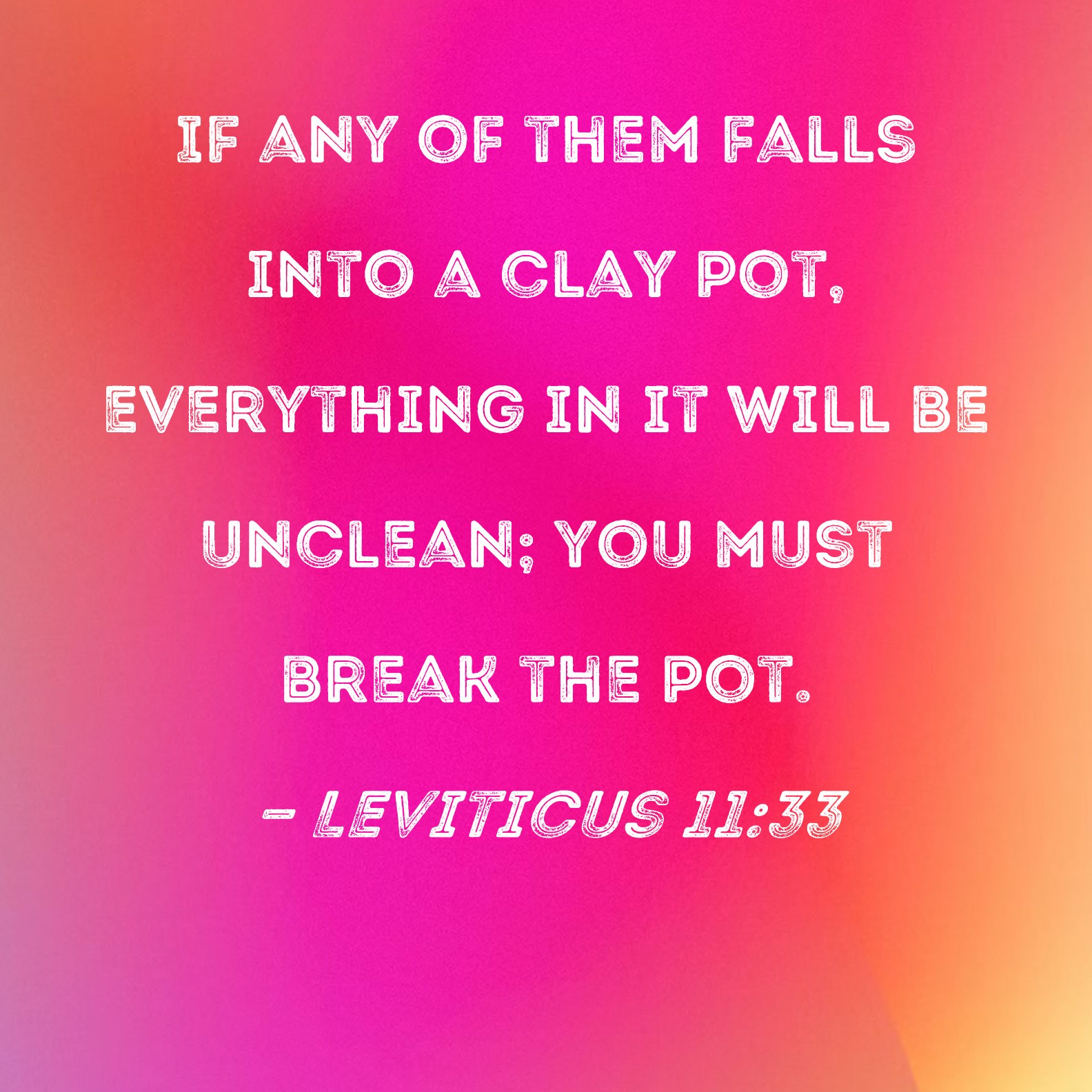 Leviticus 11:33 If any of them falls into a clay pot, everything in it will be unclean; you must break the pot.