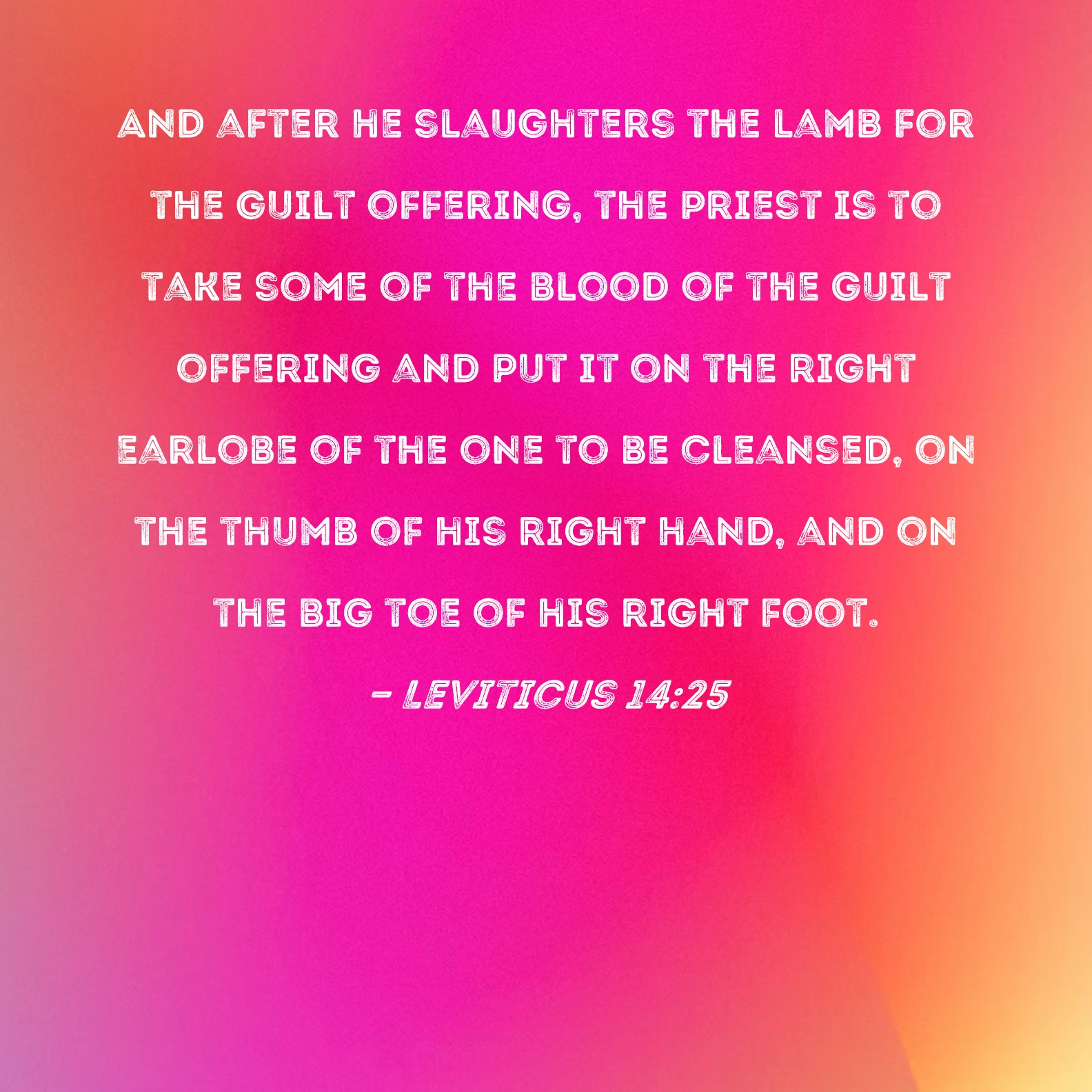 BSB: And after he slaughters the lamb for the guilt offering, the priest is to take some of the blood of the guilt offering and put it on the right earlobe of the one to be cleansed, on the thumb of his right hand, and on the big toe of his right foot. KJV: And he shall kill the lamb of the trespass offering, and the priest shall take some of the blood of the trespass offering, and put it upon the tip of the right ear of him that is to be cleansed, and upon the thumb of his right hand, and upon the great toe of his right foot: DRB: And the lamb being immolated, he shall put of the blood thereof upon the tip of the right ear of him that is cleansed, and upon the thumb of his right hand, and the great toe of his right foot: DBT: And he shall slaughter the he-lamb of the trespass-offering; and the priest shall take of the blood of the trespass-offering, and put it upon the tip of the right ear of him that is to be cleansed, and upon the thumb of his right hand, and on the great toe of his right foot. ERV: and he shall kill the lamb of the guilt offering, and the priest shall take of the blood of the guilt offering, and put it upon the tip of the right ear of him that is to be cleansed, and upon the thumb of his right hand, and upon the great toe of his right foot: WBT: And he shall kill the lamb of the trespass-offering, and the priest shall take some of the blood of the trespass-offering, and put it upon the tip of the right ear of him that is to be cleansed, and upon the thumb of his right hand, and upon the great toe of his right foot. WEB: He shall kill the lamb of the trespass offering. The priest shall take some of the blood of the trespass offering and put it on the tip of the right ear of him who is to be cleansed, and on the thumb of his right hand, and on the big toe of his right foot. YLT: and he hath slaughtered the lamb of the guilt-offering, and the priest hath taken of the blood of the guilt-offering, and hath put on the tip of the right ear of him who is to be cleansed, and on the thumb of his right hand, and on the great toe of his right foot;Links Leviticus 14:25 NIV • Leviticus 14:25 NLT • Leviticus 14:25 ESV • Leviticus 14:25 NASB • Leviticus 14:25 KJV • Leviticus 14:25 Interlinear • Leviticus 14:25 Commentaries • Leviticus 14:25 Parallel Texts • Leviticus 14:25 Bible Apps • Leviticus 14:25 Parallel • Bible Hub |