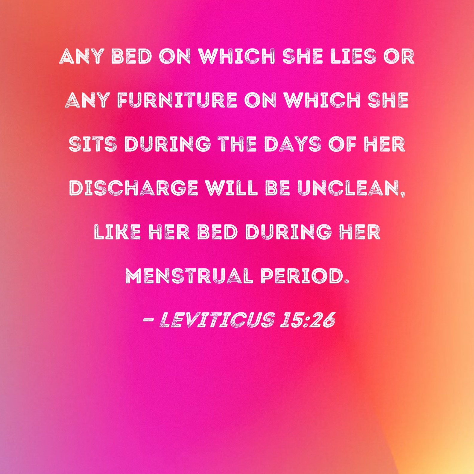 Leviticus 15:26 Any bed on which she lies or any furniture on which she sits during the days of her discharge will be unclean, like her bed during her menstrual period.
