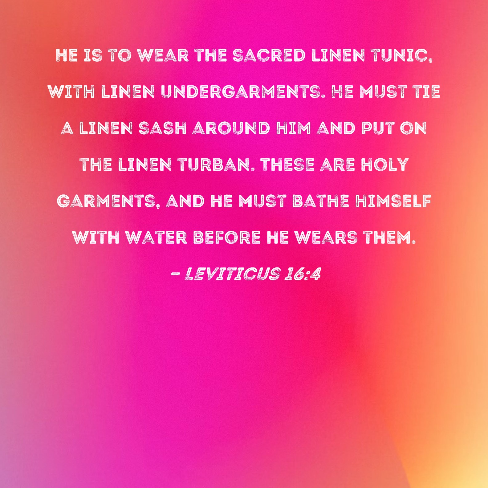 Leviticus 16:4 He is to wear the sacred linen tunic, with linen undergarments. He must tie a linen sash around him and put on the linen turban. These are holy garments, and he must bathe himself with water before he wears them.