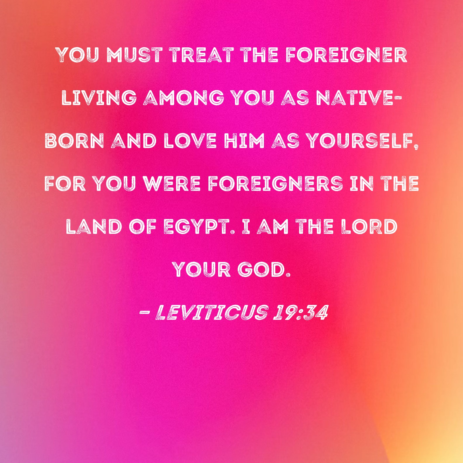 Leviticus 19:34 You must treat the foreigner living among you as native-born and love him as yourself, for you were foreigners in the land of Egypt. I am the LORD your God.