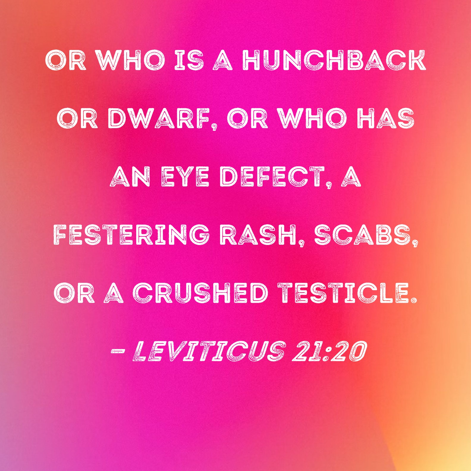 Leviticus 21:20 or who is a hunchback or dwarf, or who has an eye defect, a festering rash, scabs, or a crushed testicle.