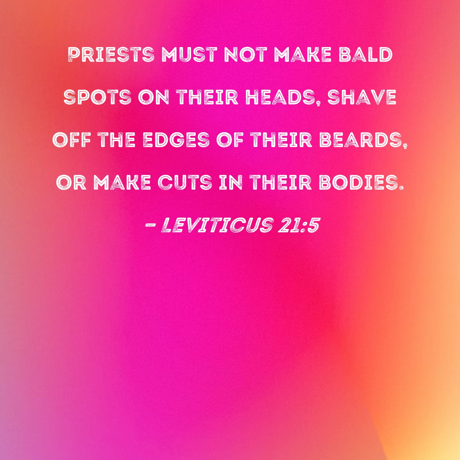 Leviticus 21:5 Priests must not make bald spots on their heads, shave off the edges of their beards, or make cuts in their bodies.