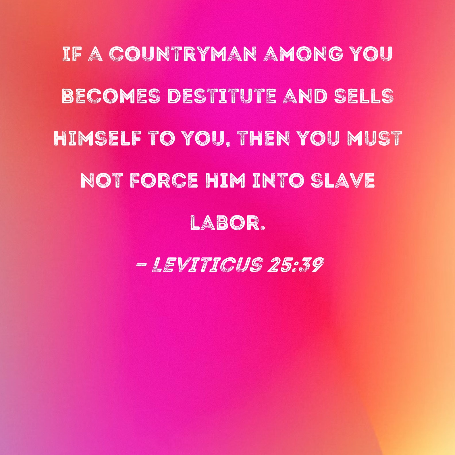 Leviticus 25:39 If a countryman among you becomes destitute and sells himself to you, then you must not force him into slave labor.
