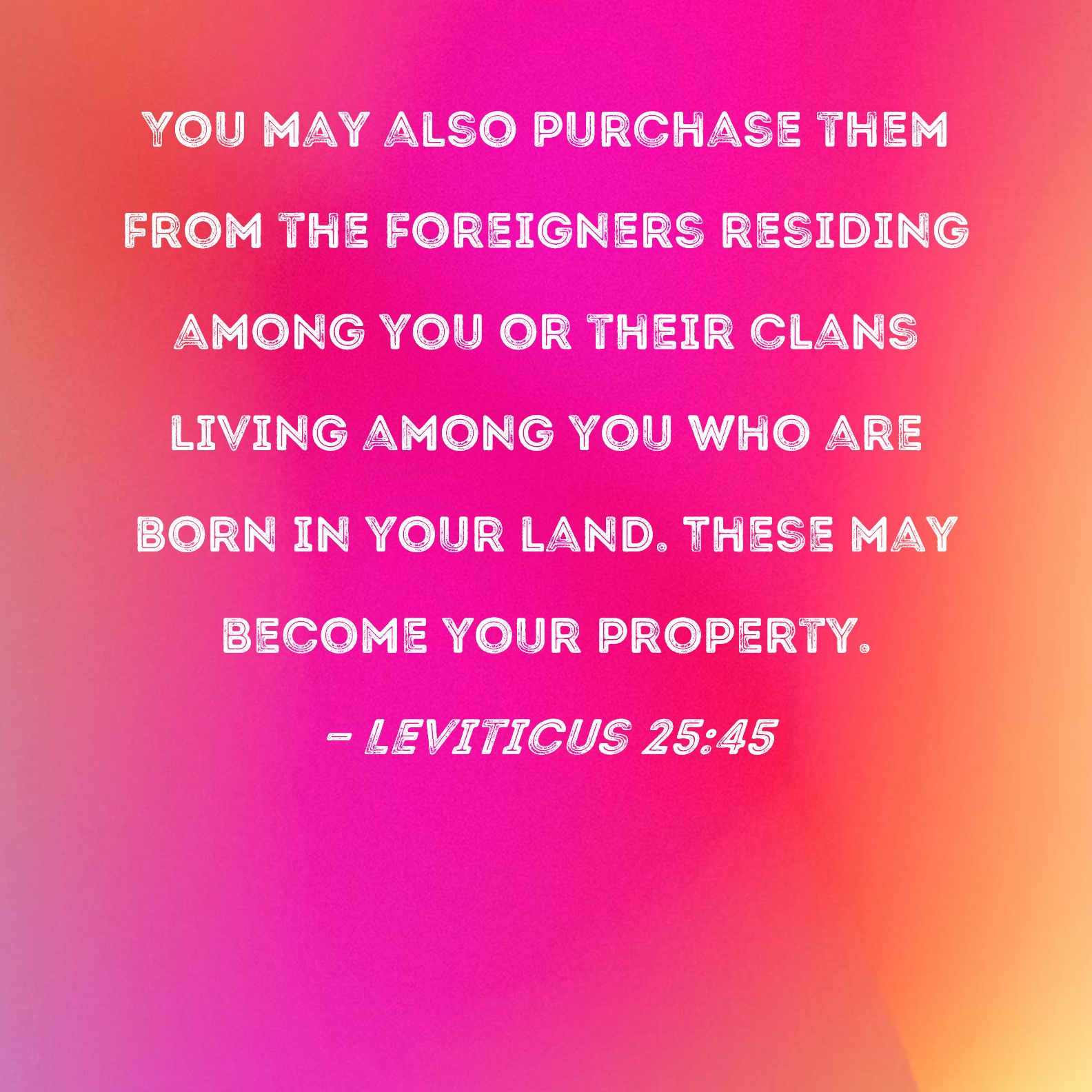Leviticus 25:45 You may also purchase them from the foreigners residing among you or their clans living among you who are born in your land. These may become your property.