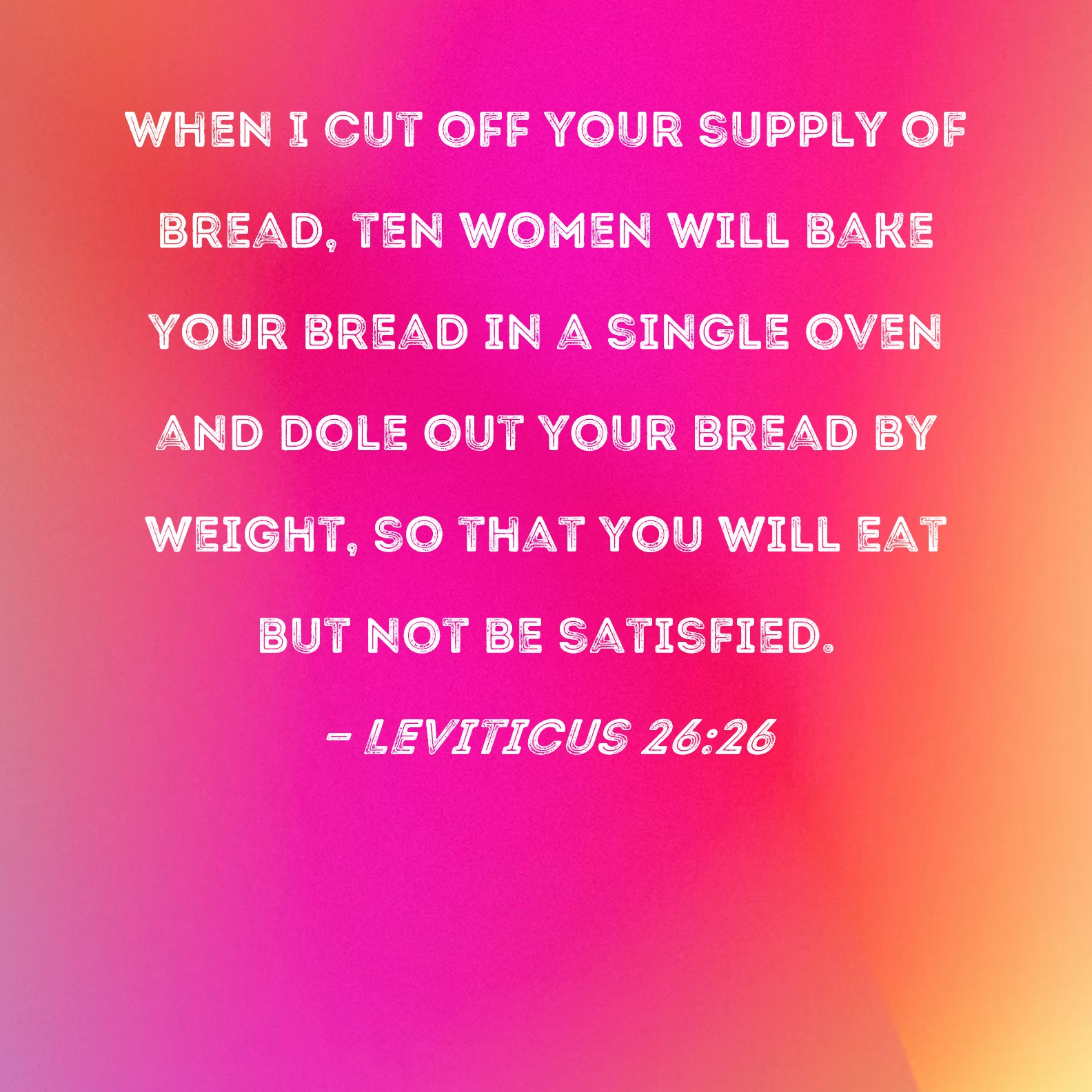Leviticus 26:26 When I cut off your supply of bread, ten women will bake your bread in a single oven and dole out your bread by weight, so that you will eat but not be satisfied.