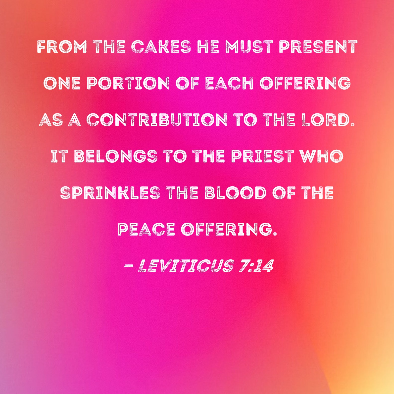 Leviticus 7:14 From the cakes he must present one portion of each offering as a contribution to the LORD. It belongs to the priest who sprinkles the blood of the peace offering.