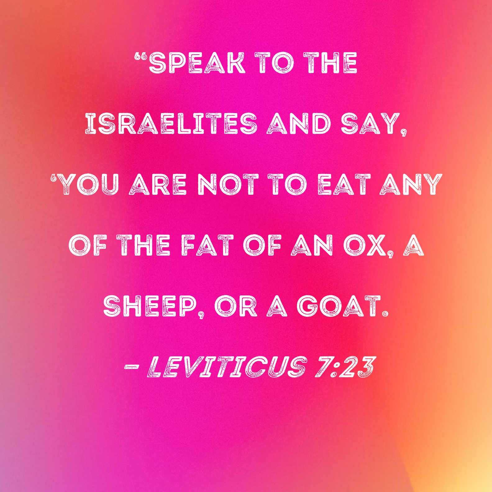 Leviticus 7:23 "Speak to the Israelites and say, 'You are not to eat any of the fat of an ox, a sheep, or a goat.