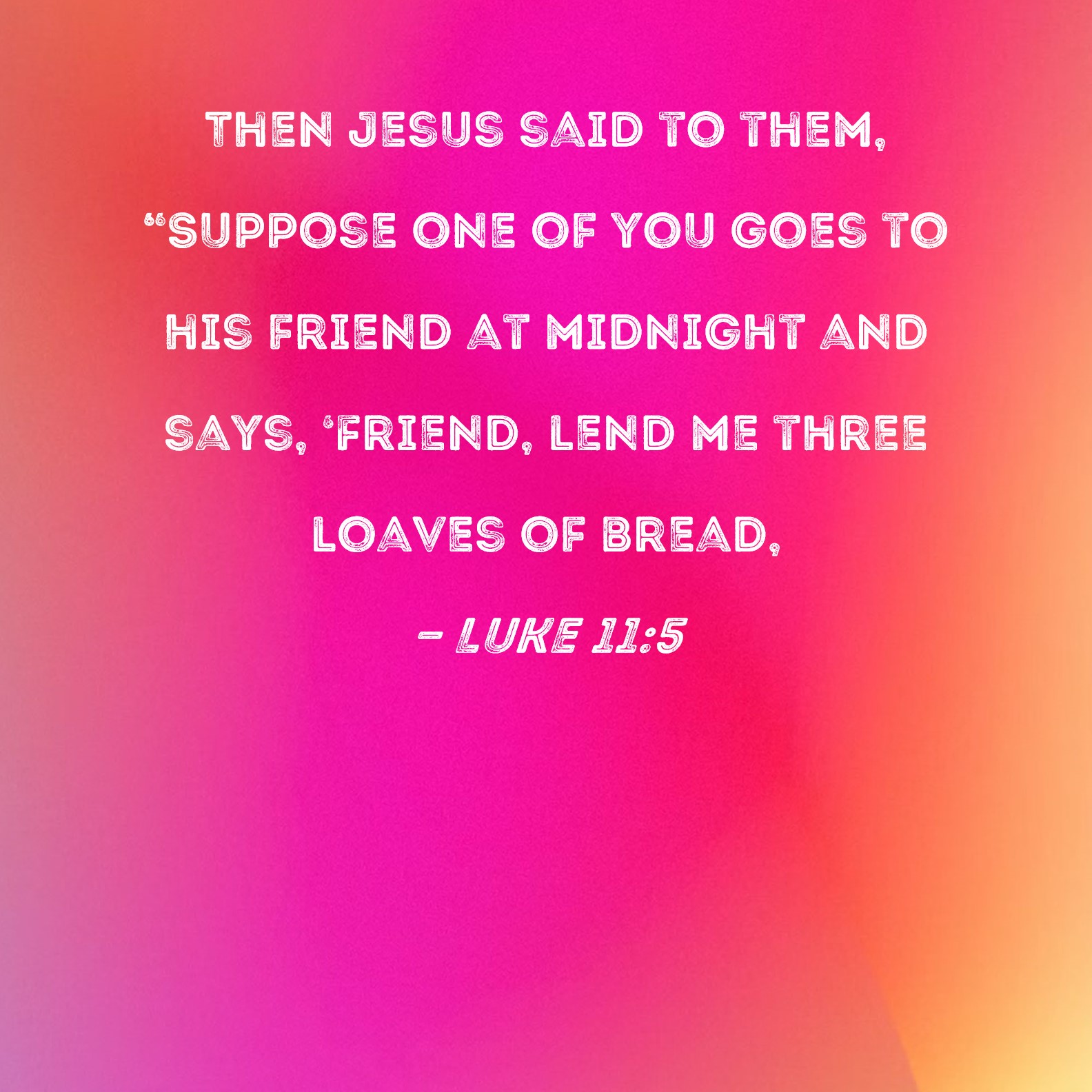 Luke 11:5 Then Jesus said to them, "Suppose one of you goes to his friend at midnight and says, 'Friend, lend me three loaves of bread,