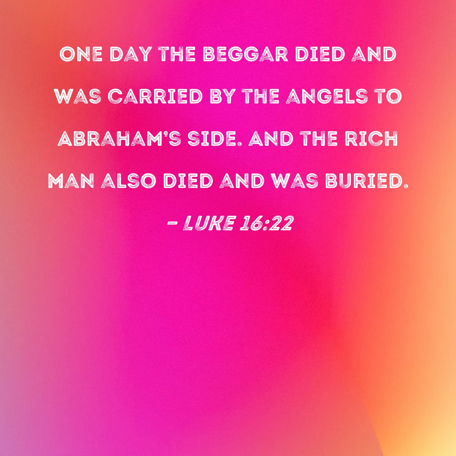 Luke 16:22 One day the beggar died and was carried by the angels to Abraham's side. And the rich man also died and was buried.