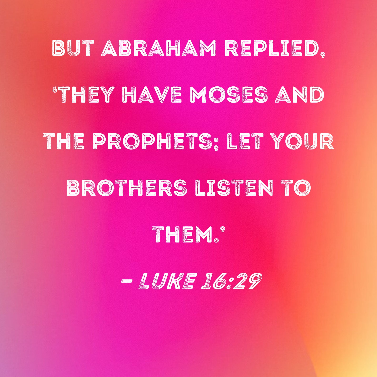 Luke 16:29 But Abraham replied, 'They have Moses and the prophets; let your brothers listen to them.'