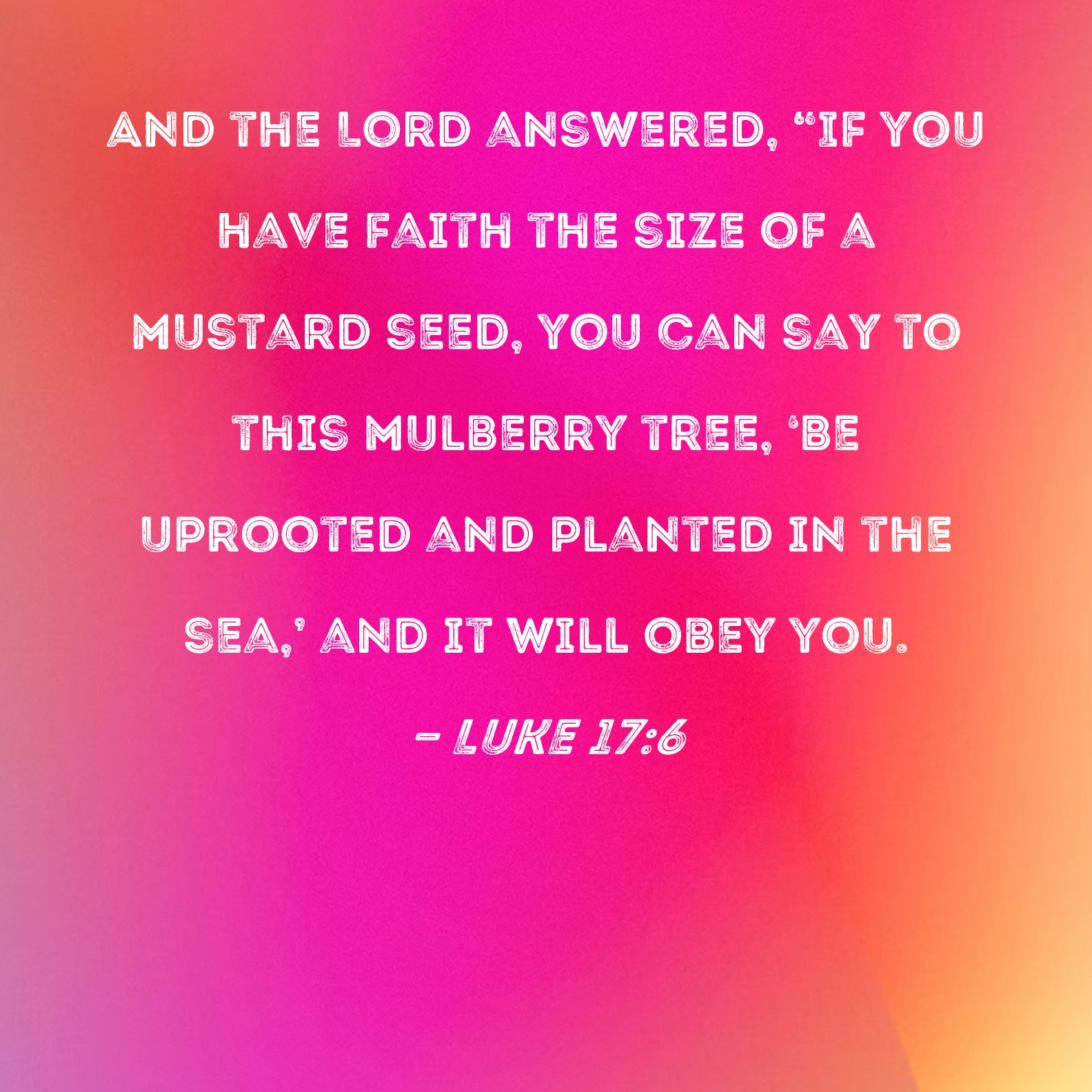 Luke 17:6 And the Lord answered, "If you have faith the size of a mustard seed, you can say to this mulberry tree, 'Be uprooted and planted in the sea,' and it will obey you.