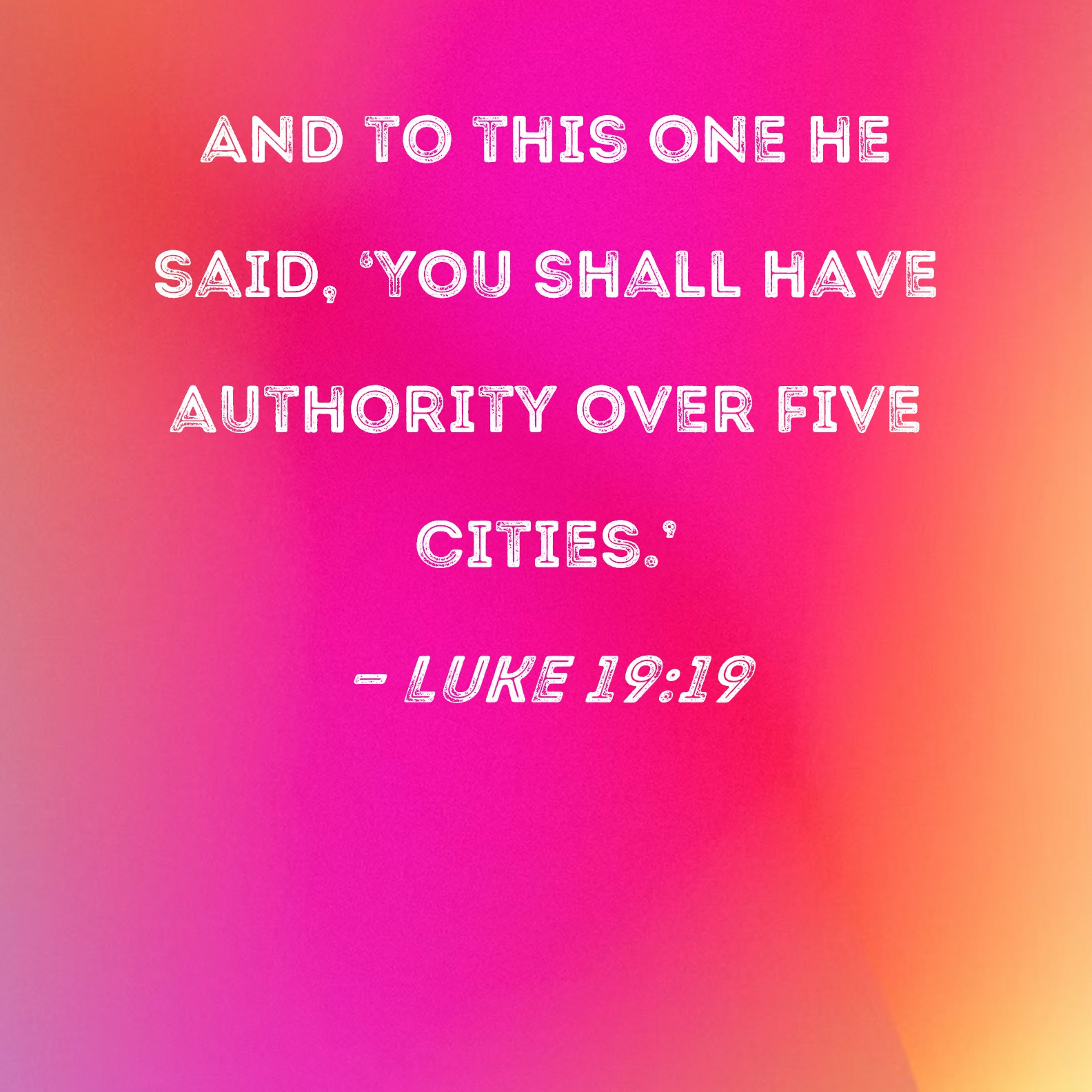 Luke 19:19 And to this one he said, 'You shall have authority over five cities.'